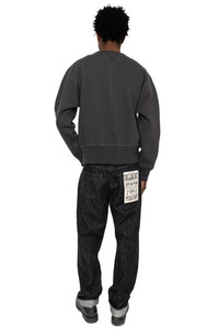 The loopwheel sweatshirt, now only produced in Wakayama Prefecture, Japan, using machines that are still in existence, is made with an inefficient process that yields only about 10 meters of fabric per day, just like the American sweatshirts of the 1940s and 50s. However, its greatest appeal lies in its soft texture and superior comfort. This luxurious loopwheel sweatshirt is made from pre-dyed Zimbabwean cotton (brown cotton). This process allows you to directly enjoy the natural feel of the raw cotton fibers. The garment is constructed using flatlock stitching with a Union Special sewing machine. The ribbing uses a random needle-out technique. The gusset is a double V-insert design. The neck ribbing is sewn with a double-needle sewing machine, resulting in a meticulously crafted sweatshirt with numerous thoughtful details. - Color: Ink Black - 100% cotton - Made in Japan - Model is 6'2 wearing a size 40