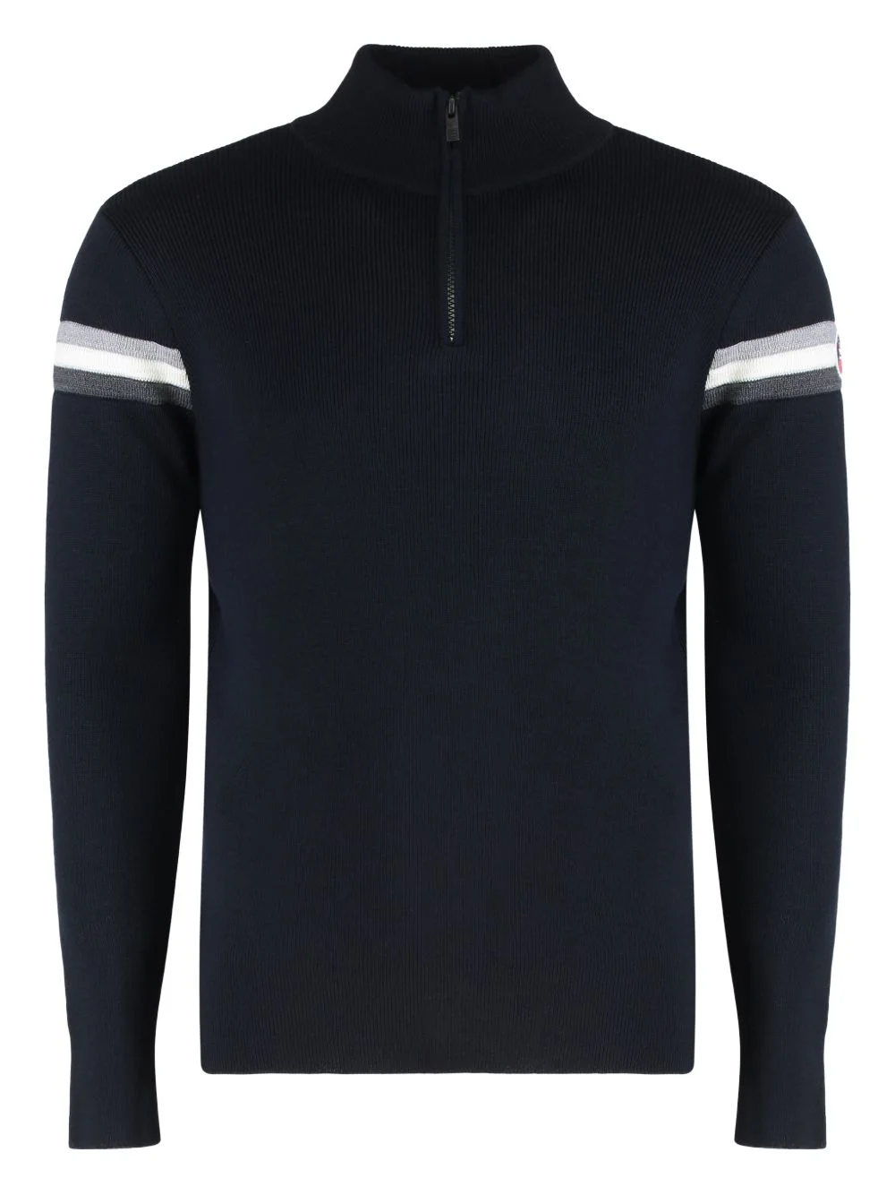 half-zip sweater Highlights - Navy blue - Ribbed knit - Half-zip fastening - Stripes on sleeve - Turtleneck Imported Composition Merino 100% Washing instructions Read Manufacturer Guidelines