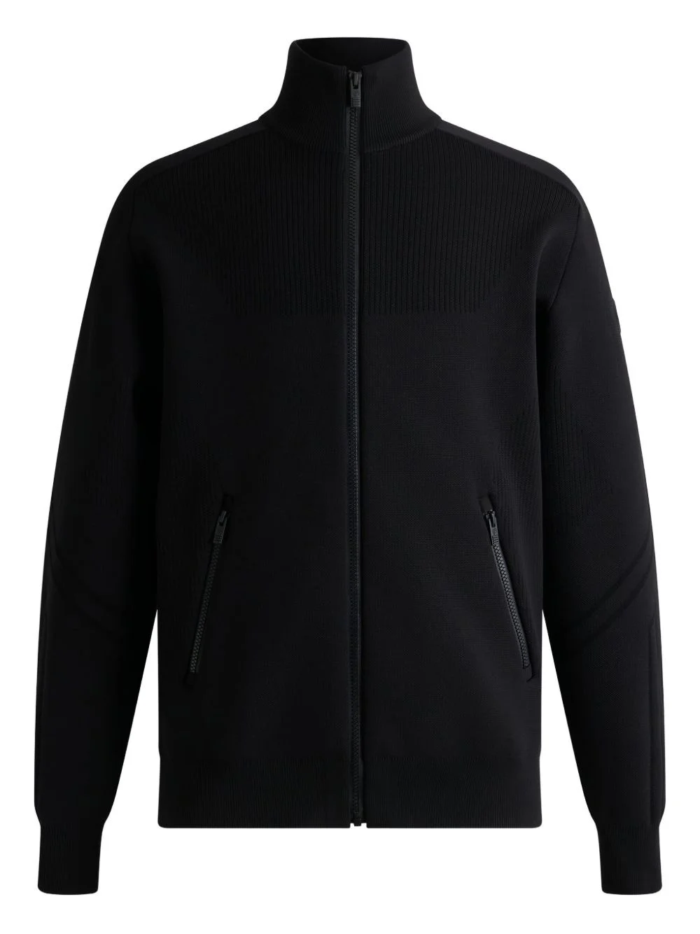 intarsia-panel ribbed bomber jacket Highlights - Black - Ribbed texture - Zip fastening - Intarsia panels - High neck - Welt pockets Imported Composition Wool 51%, Polyester 49% Washing instructions Read Manufacturer Guidelines