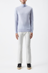 The Jermaine Sweater is a classic extra fine merino turtleneck that can be perfect for layering under a jacket or worn alone. Crafted in the finest wool the yarn looks crisp and clean while also having a soft and luxurious hand feel. The knit top is simple and versatile. Details: - 100% Merino Wool - Made in Italy Size and Fit: Fits true to size. Model is 5'11" and wearing a size 38.