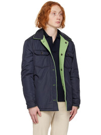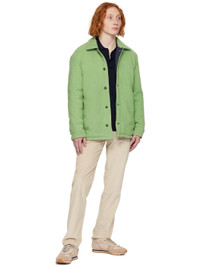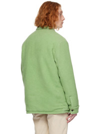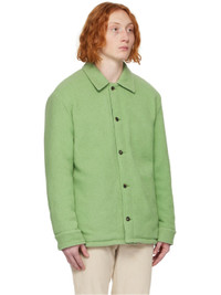 Insulated recycled cashmere boucle jacket. Reverse in navy recycled nylon satin. · Spread collar · Button closure · Flap pockets and seam pockets · Single-button barrel cuffs Supplier color: Aventurine green Body 1: 100% recycled cashmere. Body 2: 100% recycled polyamide. Fill: 50% recycled cashmere, 50% recycled polyester. Made in Italy 231854M180004