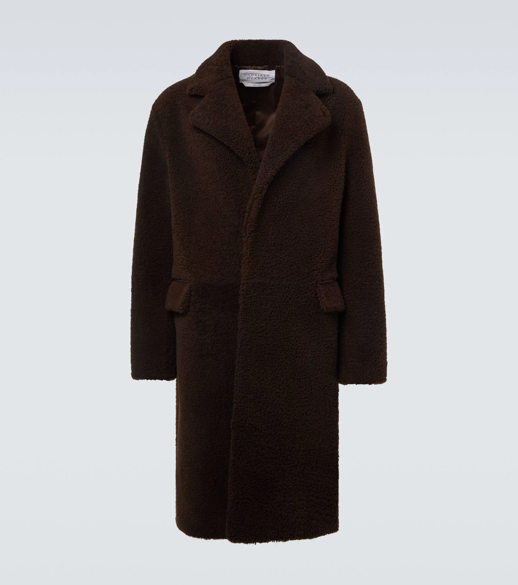 Crafted from shearling, the Teddy coat by Gabriela Hearst showcases a full-length design with a concealed front closure and a tonal button at the collar. This sophisticated style is complete with side pockets. Product Details - Material: 100% shearling - Care instructions: specialist clean - Made in Italy - Designer color name: Chocolate - Item color: brown - Lining: 100% cupro - Trim: 100% lamb leather - Contains non-textile parts of animal origin - Pockets: flap pockets - Closure: buttoned placket - Item number: P01070326 Size & Fit - True to size - Dropped shoulders - Designed for a loose fit - Non-stretchy fabric - The model in the picture is 185cm-6'1" and wearing a size IT 50