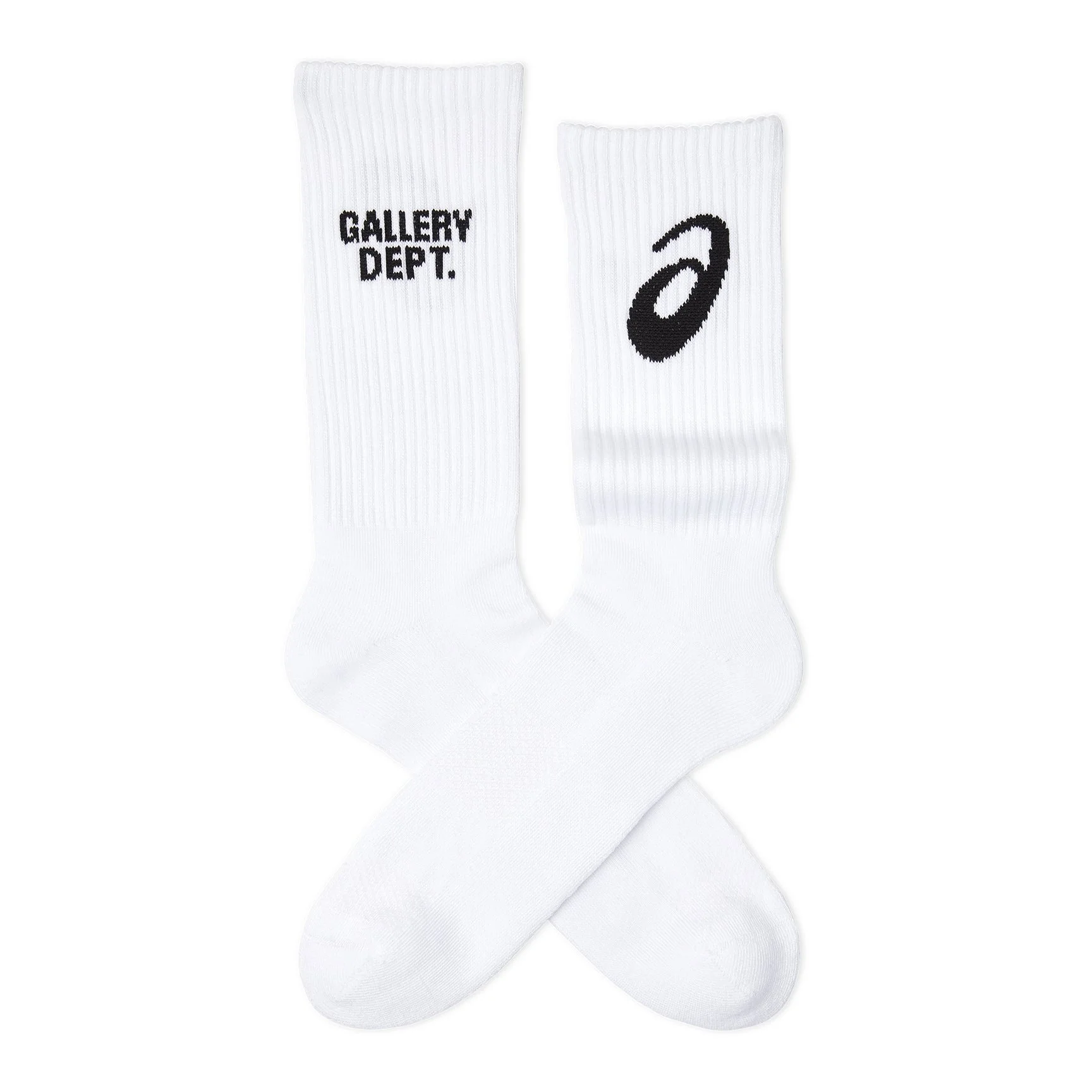 Soft mid-calf cotton socks featuring GD ENGLISH on one side and ASICS on the other. Artistic Details GALLERY DEPT. X ASICS - Mid-calf length. - GD ENGLISH logo and ASICS logo. - Made with recycled cotton. Materials: 52% Up-Cycled Cotton / 40% Recycled Polyester / 8% Elastane Recommended Sizing: S: M 5-6.5 / W 4-7.5 M: M 7-9 / W 8-9.5 L: M 9.5-11.5 / W 10+ XL: M 12+
