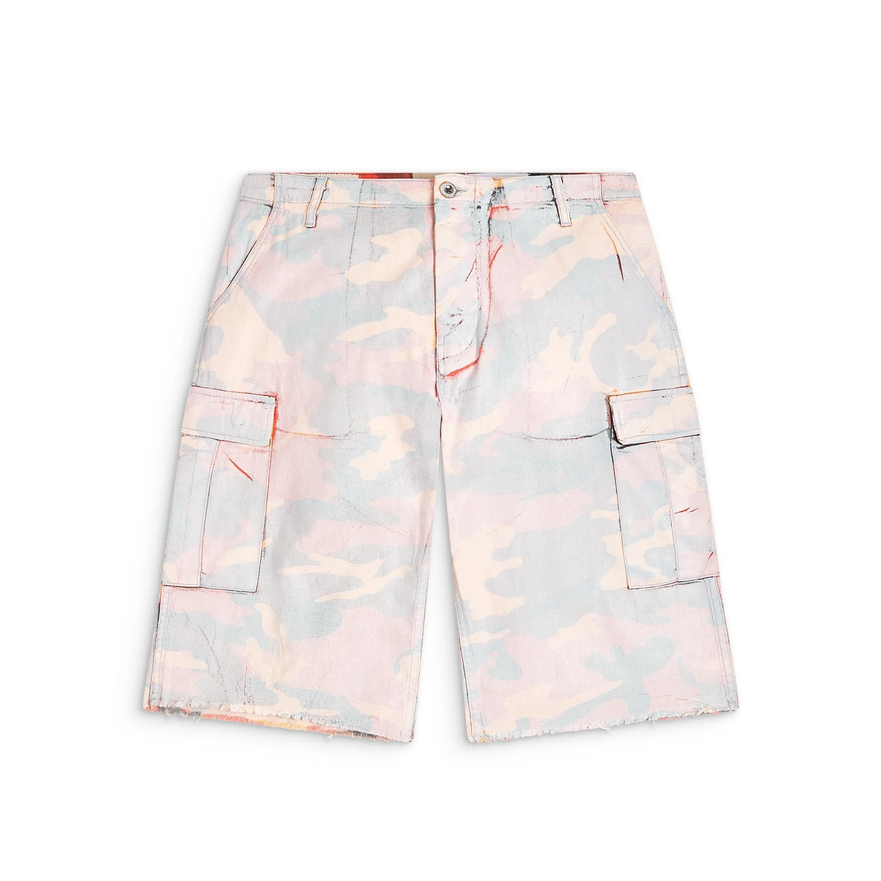 Relaxed cargo shorts with all-over camo print, raw hem, and soft coated finish. Artistic Details - Relaxed fit cargo shorts. - Finished with a soft coated treatment. - All-over camo print. - Raw hem. Made in USA Material: 100% Cotton
