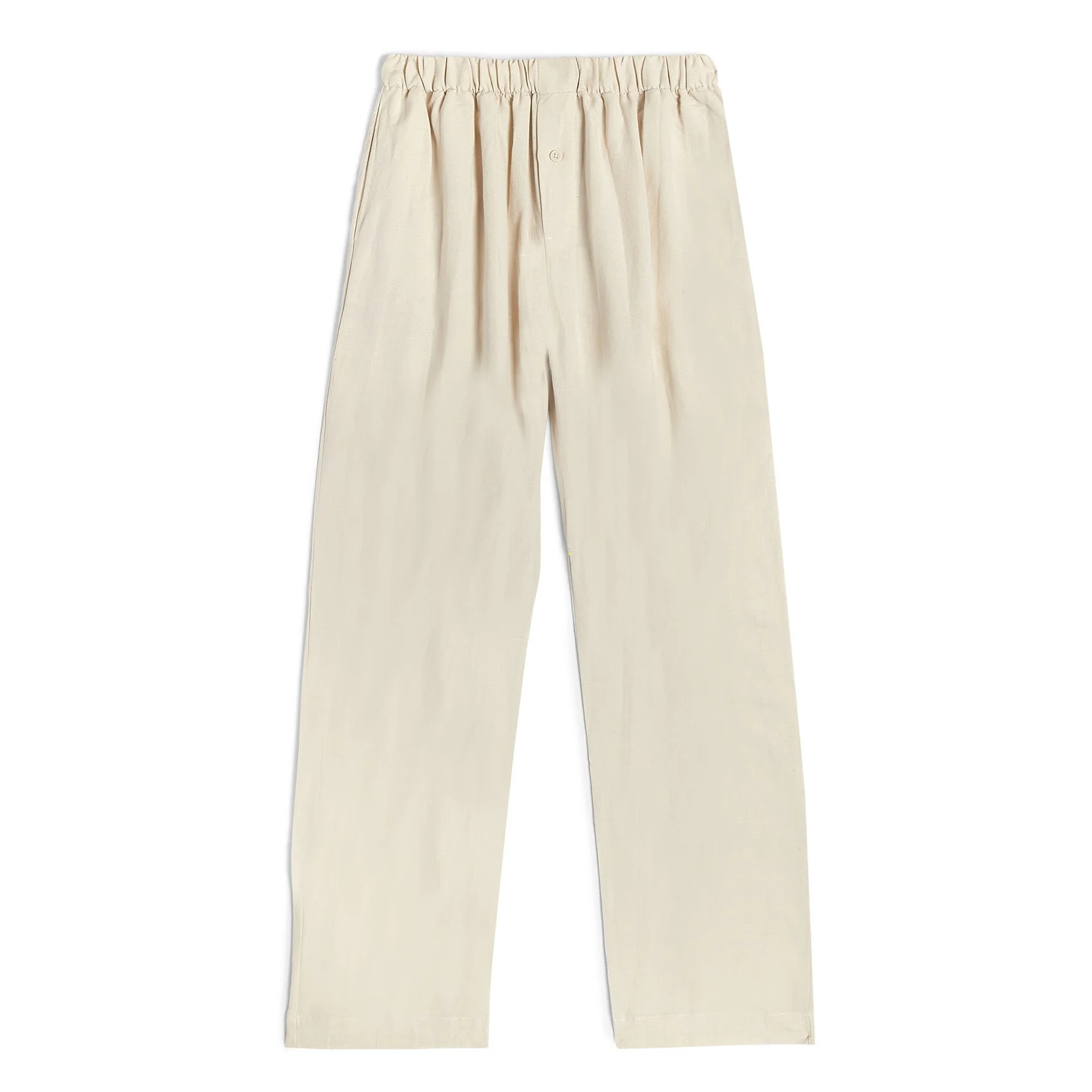 The Chateau Josue Pajama pants are made from vintage linen. They have an oversized silhouette finished with an elasticized waistband. Classic dual slit pockets at waist and straight leg drape. Model: 6'3" wearing size XL Artistic Details Chateau Josue, by artist Josue Thomas, merges luxury lifestyle with contemporary culture. - Lightweight vintage textured linen pajamas. - Oversized fit. - Elasticized waistband. - Dual slit pockets. - Straight-leg. - This garment has been treated to achieve an aged quality making the color an off-white. Made in USA Material: 100% Linen