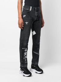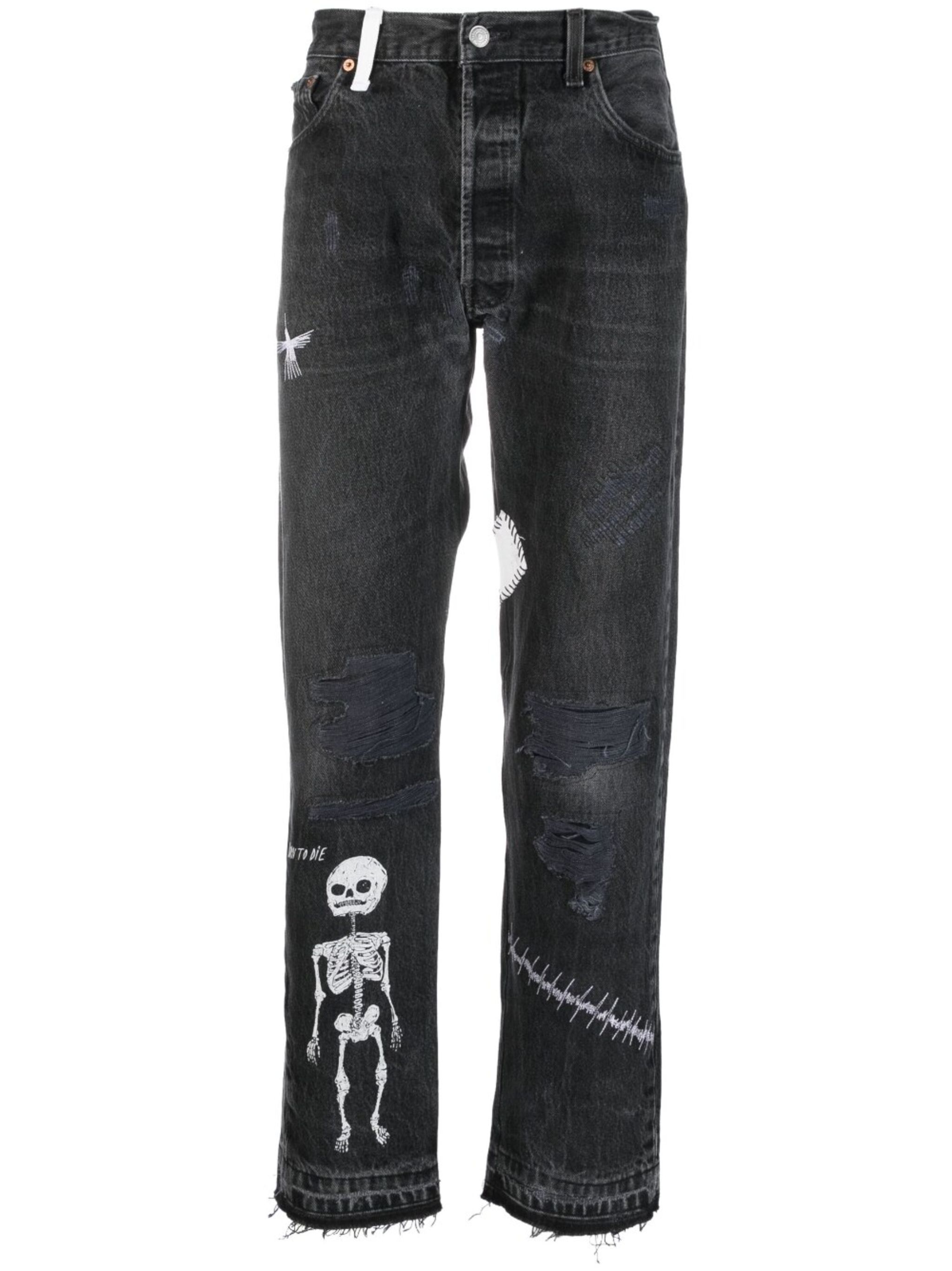 mid-rise straight-leg jeans from GALLERY DEPT. featuring black/white, cotton, denim, logo patch to the rear, skull print to the front, embroidered motif, patch detail, ripped detailing, straight leg, mid-rise, concealed fly and button fastening, belt loops and classic five pockets. Size & Fit Model Measurements: Height: 1.87 m Bust/Chest: 94.0 cm Hips: 86.0 cm Waist: 71.0 cm Model wears size 32 Fabric and Care Designer Style ID: FFD5000 Designer Colour: BLCK BLACK Composition: Cotton 100% Washing instructions: Dry Clean Only Made in United States
