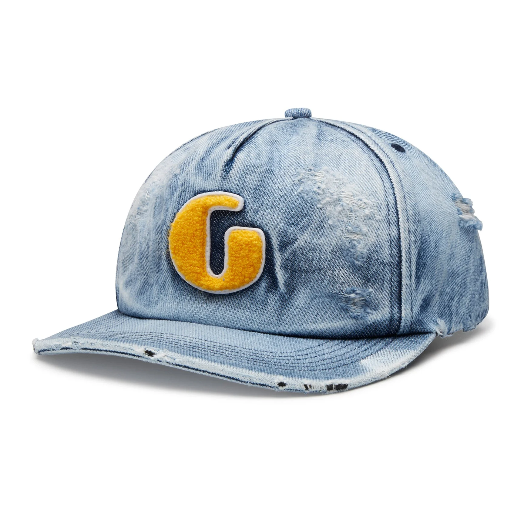 Denim 6-panel cap with a curved bill, light distressing, and adjustable snapback closure. Features a chenille-finished embroidered "G" patch on a 6-panel denim trucker design. Artistic Details - Denim 6-panel cap. - Chenille-finished embroidered "G" patch. - Distressed and treated for a worn look. - Curved bill. - Adjustable snap closure. Made in USA Material: 100% Cotton