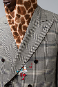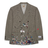 We honor the craft, but we refuse to be confined by it. Each suit is a study in contrasts: precision and freedom, tradition and disruption. Each piece is crafted in Italy with the expertise of master ateliers. Each piece begins with the structure of classic tailoring, evolving through a unique process of deconstruction and transformation. The result: a suit that embodies the discipline of craft with the soul of contemporary art. Artistic Details - Hand-tailored double-breasted suit jacket. - Front flap pockets, button closure, buttoned cuffs, and inner pockets. - FRENCH DEPT. logotype embroidered at the back collar. - Hand-painted by artisans at our Los Angeles maison. - Appliqued with our 'art on display' patch by the cuff. - Dry clean only. Made in Italy Material: 50% Virgin Wool / 50% Acrylic