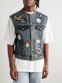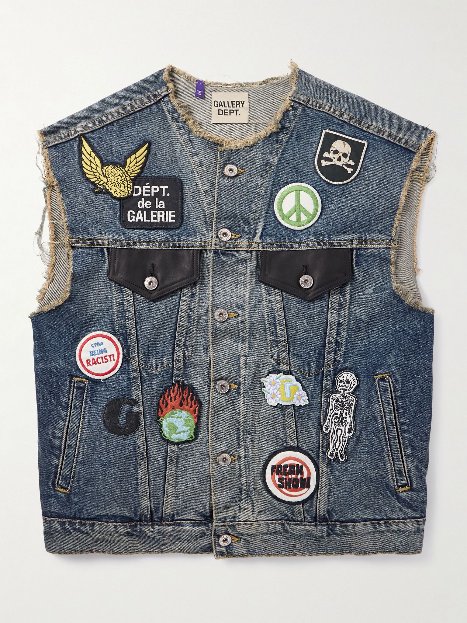 Midnight Leather-Trimmed Appliquéd Denim Vest Blue
