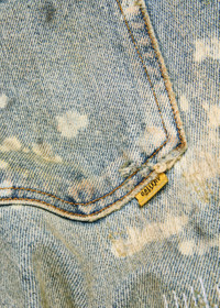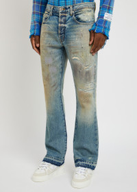 Info & Care Gallery Dept. denim jeans Mid-rise fit, flared-leg cut, belt loops, five pockets, designer embroidery at front patch pocket, designer plaque and tag at back, slightly whiskered, designer hardware, distressed and bleached finish; Partially concealed button fastenings at front 100% cotton Dry clean; Size & Fit Front rise: 11 inches/ 28cm Inside leg length: 32 inches/ 81cm Midweight Model is 6'1"/ 186cm and wears a size;W32