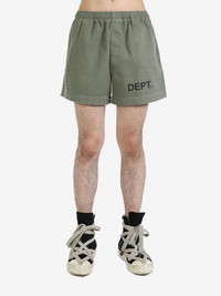 logo-print cotton shorts Highlights - Green - Cotton - Logo print at the leg - Elasticated waistband - Two side inset pockets - Rear patch pocket - Thigh-length Made in United States Composition Cotton 100%