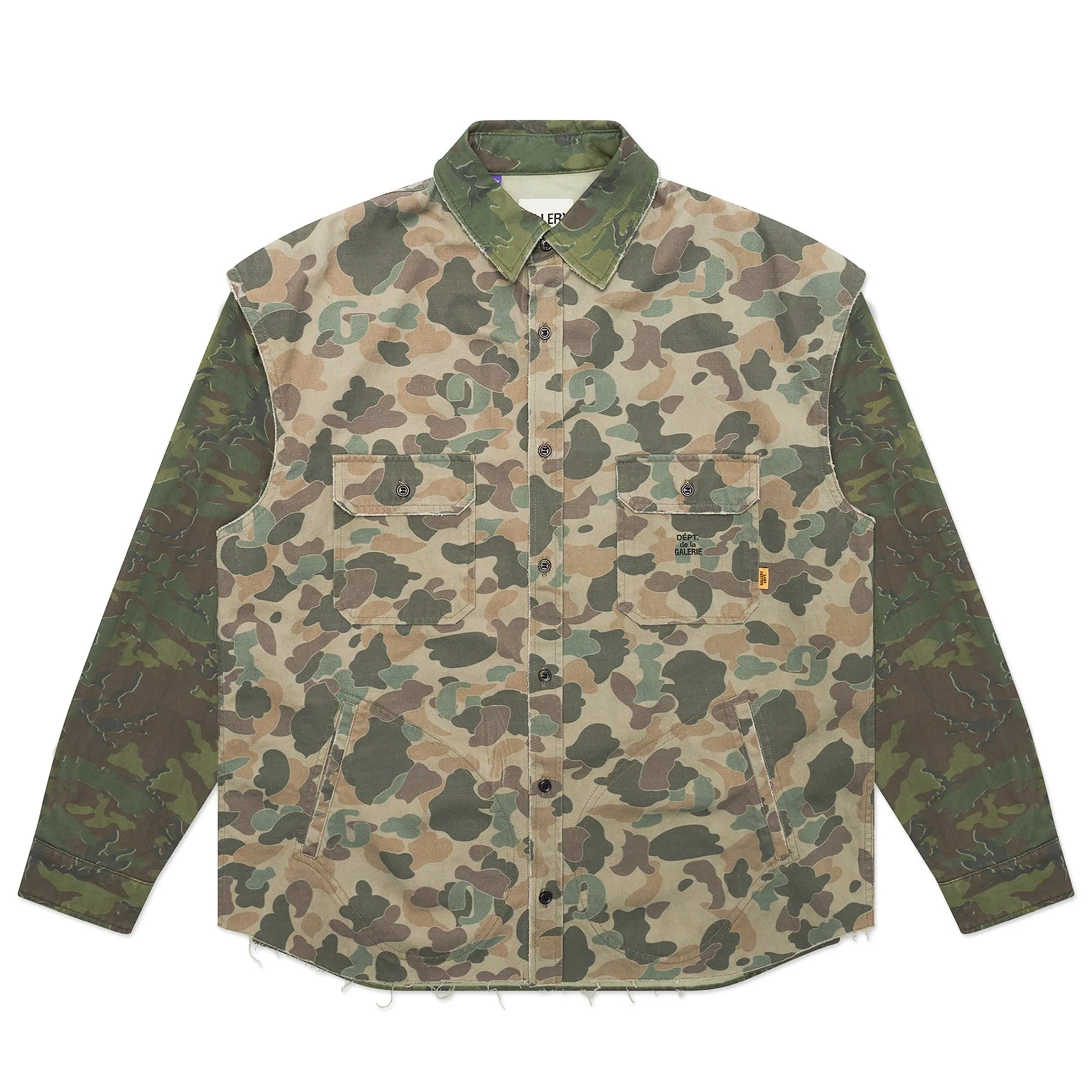 Long sleeve shirt-jacket with built-in vest overlay, mixed camo prints, button flap pockets, subtle distressing, and FRENCH logo detailing. Model: 6" wearing size L Artistic Details - Long sleeve shirt-jacket with built-in vest overlay. - Features mixed camo prints. - Button front flap pockets. - Slight distressing on the collar and sleeves. - FRENCH logotype on the front and back. - Appliqued with our 'art on display' patch by the cuff. - Dry clean only. Made in USA Material: 100% Cotton Twill