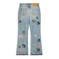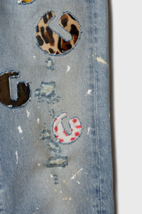 Slim fit with wide leg opening and 5-pocket design. Each pair is distressed, reinforced, repaired, and hand-painted with custom GD hardware. Model: 6'2" wearing size 32 Artistic Details - Slim fit silhouette with a wide leg opening. - 5-pocket design. - Adorned with assorted denim and leather G-patches. - Each pair is individually distressed, reinforced, and repaired. - Patchwork detailing with cut-out and sewn-underneath construction. - GD custom hardware. - Hand-painted and stained by artisans at our Los Angeles maison. - Debossed tan leather GALLERY DEPT. jacron on the back waistband. - Released hem. Made in USA Material: 100% Cotton