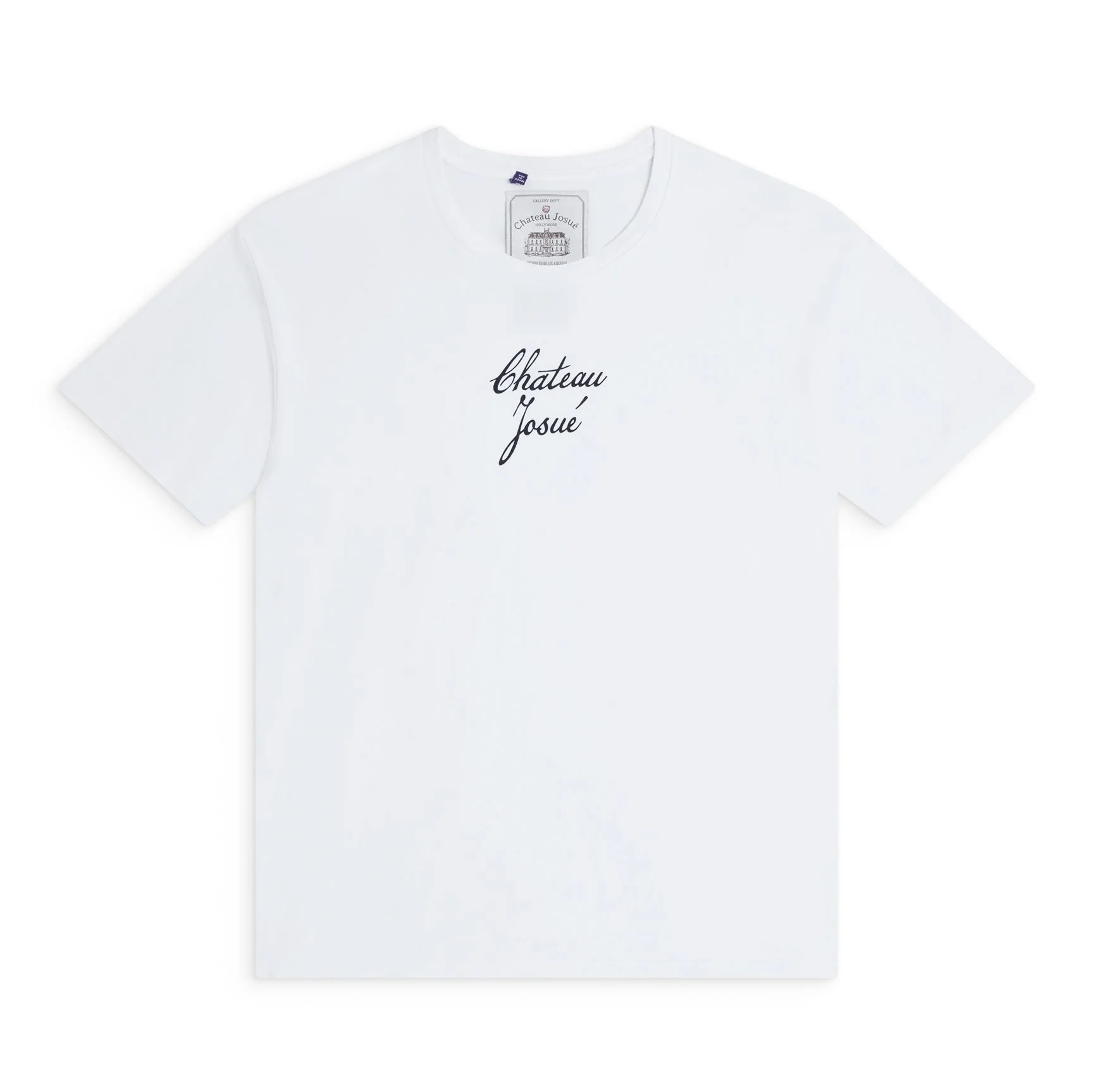 A relaxed 90’s fit tee featuring Chateau Josue script typography. Model: 6" wearing size L Artistic Details Chateau Josue, by artist Josue Thomas, merges luxury lifestyle with contemporary culture. - Relaxed 90's fit short sleeve. - Shrunken printed Chateau Josue script typography. - Ribbed neck. - Soft cotton jersey. Made in USA Material: 100% Supima Cotton