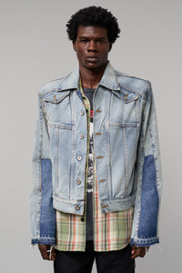 Denim jacket with flared sleeves and button-front flap pockets, accented by GD custom hardware and inner shoulder pads for added shape. Finished with an ‘art on display’ patch on the cuff and a debossed tan leather GALLERY DEPT. jacron on the back. Model: 6" wearing size L Artistic Details - Denim jacket with flared sleeves. - Button-front flap pockets with GD custom hardware. - Inner shoulder pads. - Appliqued with our 'art on display' patch at the cuff. - Debossed tan leather GALLERY DEPT. jacron on the back. - Dry clean only. Made in USA Material: 100% Cotton