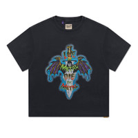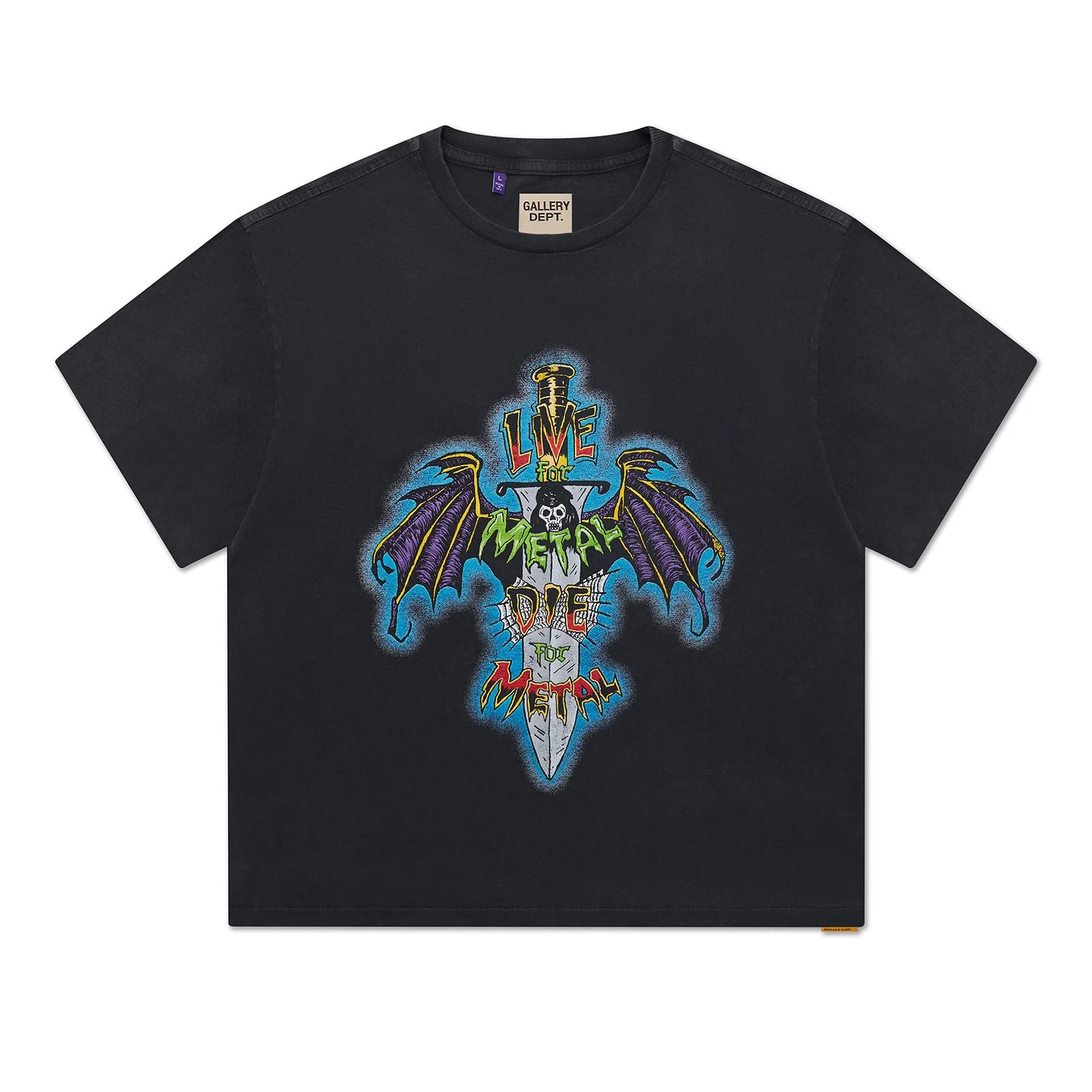 Relaxed 90's fit short sleeve featuring distressed graphics throughout the garment. Artistic Details - Relaxed 90's fit short sleeve. - Distressed 'Live Metal Die Metal' graphic on the front. - Back 'Live For Metal Die For Metal' typography layered with our GD ENGLISH logotype rendered in gold glitter. Made in USA Material: 100% Cotton