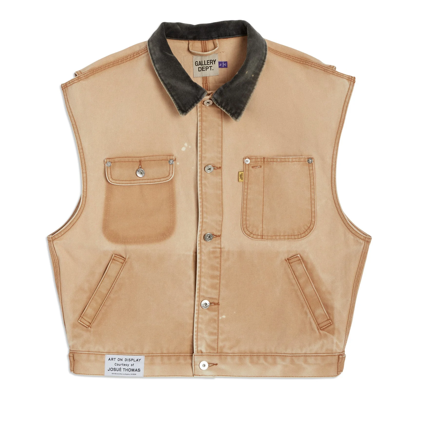 Moto canvas vest with 100% polyester lining. Features Levi's-esque tack button closure, treated leather placket, and riveting on the front pockets. Dyed with our patent process, creating a shade difference around the side pockets and hem, and appliqued with our 'art on display' patch. Model: 6'3" wearing size XL Artistic Details - Canvas vest. - Treated leather placket on the neckline. - Silver hardware detailing. - Front pockets. - Patent dye process creates visible shade differences across the garment. - Appliqued with our 'art on display' patch at the hem. Made in USA Material: 100% Cotton / Lining: 100% Polyester