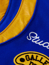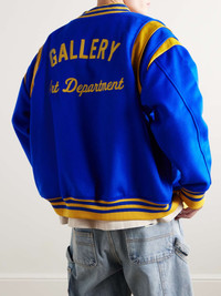 Gallery Dept.’s varsity jacket is inspired by classic collegiate style. It’s made from wool-blend felt, detailed with contrasting leather trims and appliqued with patches on the chest and sleeves. Size & Fit - Model wears a size larger to achieve a looser fit - Ribbed hem - Mid-weight, non-stretchy fabric - Model is shown wearing a L - Model measures: chest 38"/ 96cm, height 6'1"/ 185cm Details & Care - Royal-blue wool-blend felt, mustard leather - Snap fastenings - 95% wool, 5% nylon; trim: 100% leather; lining: 100% silk - Dry clean
