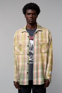 This button-down flannel boasts two pockets on each side of the front chest. Distressed accents along the neck and cuffs, paired with a fading process, infuse vintage character into the garment. Model: 6" wearing size L Artistic Details - Button-down flannel with two pockets on each side of the front chest. - Distressed accents along the neck and cuffs. - Fading process used to achieve a vintage look. - Each shirt has been appliqued with our 'art on display' patch by the cuff. Made in USA Material: 100% Cotton