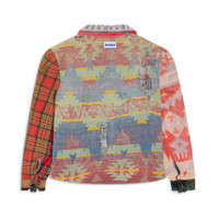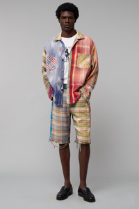 Button-down plaid flannel crafted from vintage fabrics, unique in print, wash, and distressing. Features two chest pockets and distressed neck and cuffs. Model: 6" wearing size L Artistic Details - Button-down flannel with two pockets on each side of the front chest. - Distressed accents along the neck and cuffs. - Crafted from vintage fabrics, each piece unique with mixed prints, washes, dyes and distressing. - Inner 'Retouche' patch. - Appliqued with our 'art on display' patch at the cuff. Made in USA Material: 100% Cotton / 100% Vintage Wool / 100% Cotton Blend