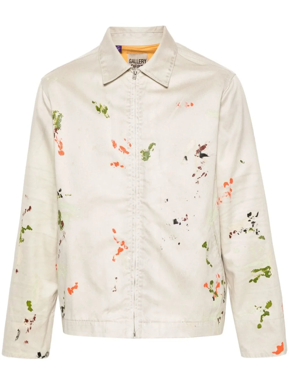 Montecito twill jacket The Montecito is one of GALLERY DEPT's mainstay silhouettes, which is frequently reinterpreted. It's inspired by Americana staples like the Ike Jacket, hence its classic, boxy profile. This version is crafted from cotton twill and embellished with calculated splashes of colour made by the brand's artisans in Los Angeles. Highlights - Light beige/multicolour - Cotton - Twill weave - Paint splatter detail - Decorative-press-stud waist tabs - Logo patch to the rear - Logo-engraved silver-tone hardware - Classic collar - Long sleeves - Press-stud fastening cuffs - Two front jetted pockets - Internal patch pocket - Concealed front zip fastening - Straight hem - Silk lining Made in United States Composition Lining: Silk 100% Outer: Cotton 100% SIZE & FIT Model measurements Height 6 ft 2 in(1.89 m) Bust/Chest 36.22 in(92 cm) Hips 35.82 in(91 cm) Waist 28.54 in(72.5 cm) FittingInformation Designed for a regular fit, allowing for a comfortably loose fit throughout the body Made from a midweight non-stretch fabric This piece fits true to size – take your usual size Washing instructions Dry Clean Only