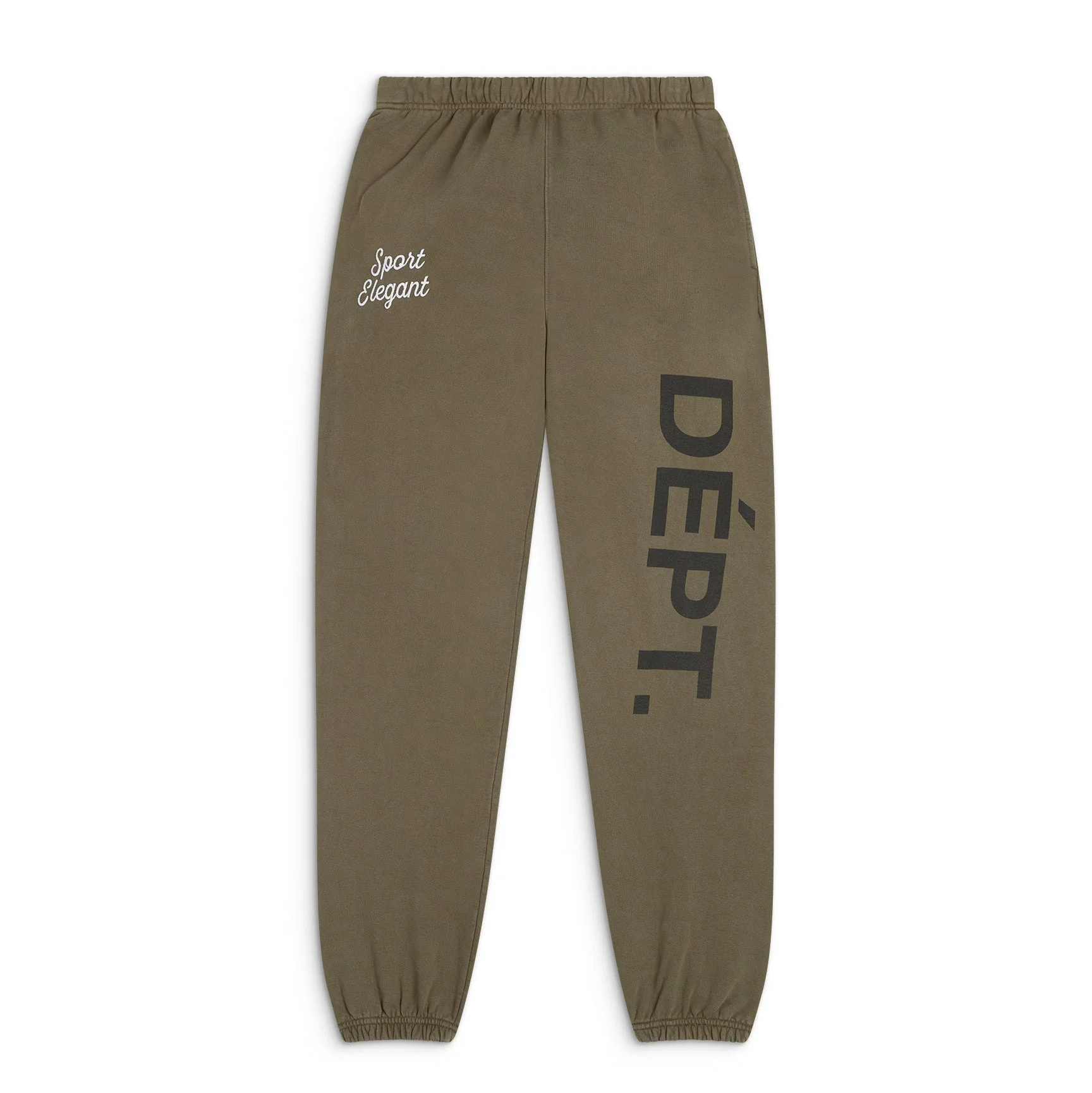 Sweatpant joggers with side seam pockets, elasticized waistband and cuffs with inner drawstring, distressed FRENCH DEPT. print on left, and embroidered Sport Elegant logotype on upper right. Model: 6" wearing size L Artistic Details - Sweatpant joggers. - Side seam pockets. - Elasticized waistband and cuffs with inner drawstring. - Distressed FRENCH DEPT. print down the left leg. - Embroidered 'Sport Elegant' logotype. - Inner 'Art on Display' patch. Made in USA Material: 100% Cotton