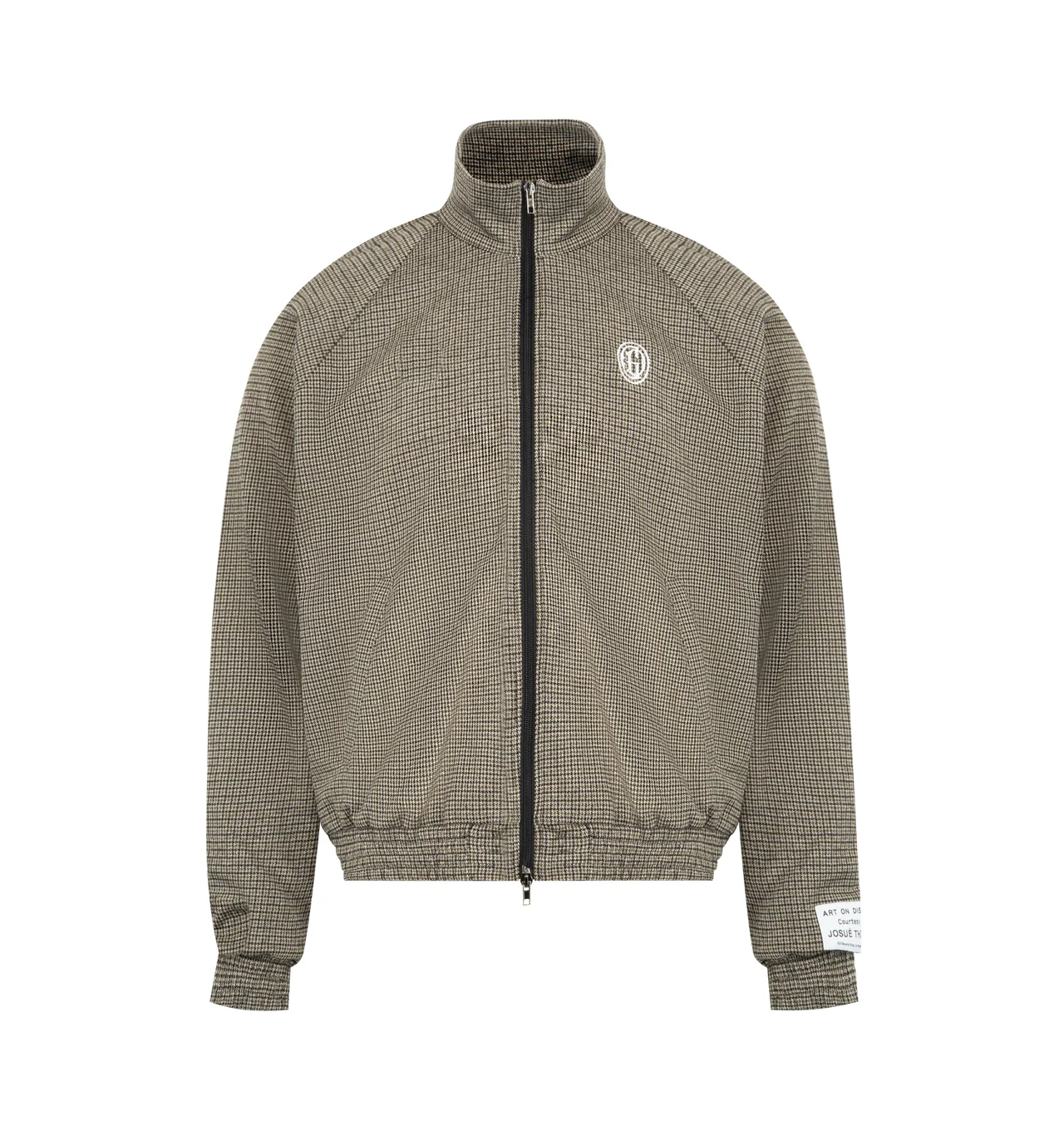 GALLERY DEPT. Track Jacket featuring plaid raglan sleeve jacket with Chateau Josue logo embroidery, front zip, side seam pockets and elasticized cuffs and hem. 46% viscose, 31% virgin wool, 14% polyester, 7% polyamide, 1% elastane. Made in Italy. DESIGNER STYLE ID: TJKT-20047 COLOR: OLIVE MICRO PLAID
