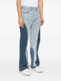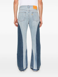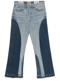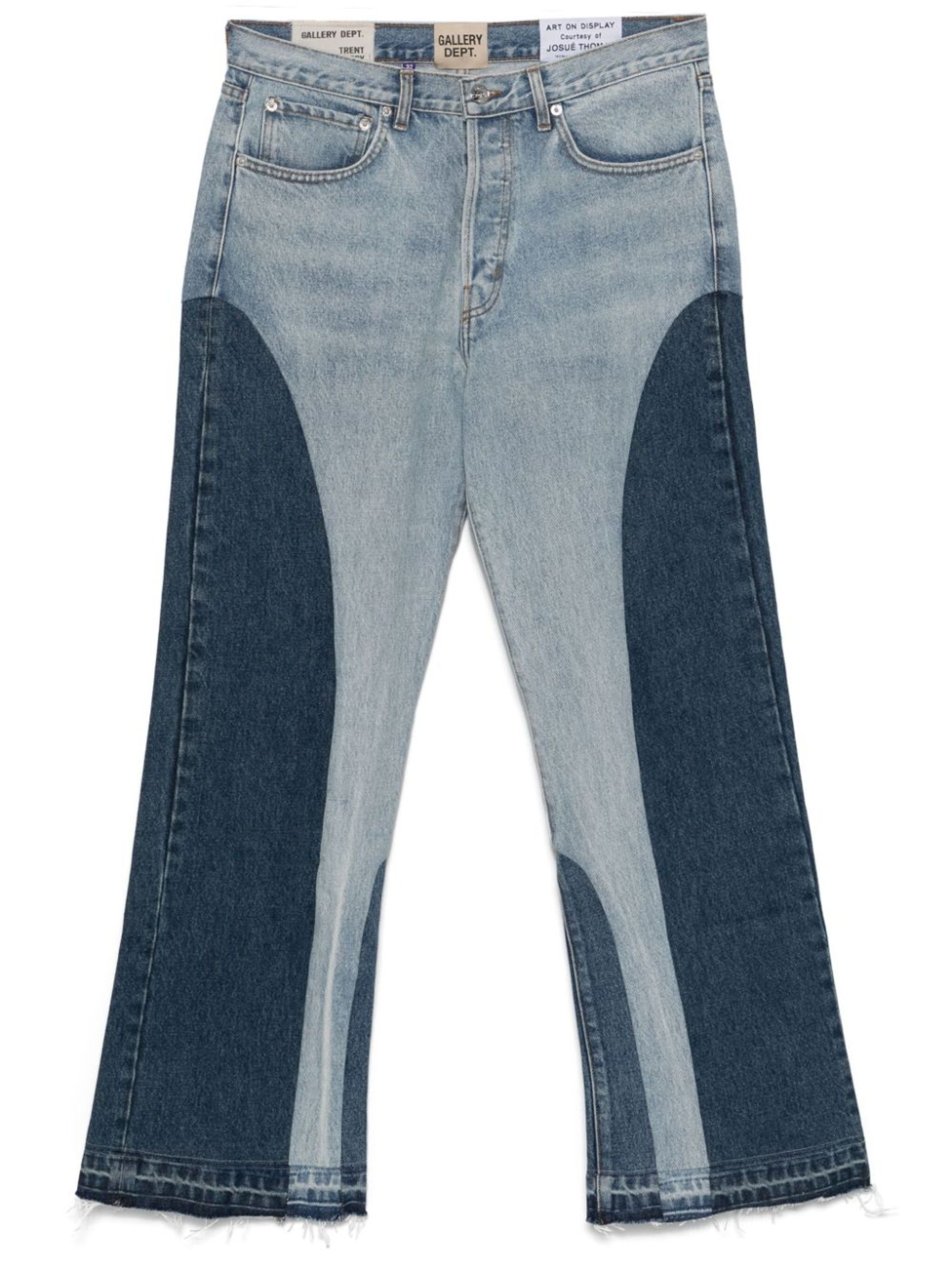 blue cotton flared applique logo two-tone design mid-rise belt loops front button fastening classic five pockets frayed hem Size & Fit Model Measurements: Height: 1.86 m Bust/Chest: 92.0 cm Hips: 96.0 cm Waist: 78.0 cm Model wears size 32/32 Fabric and Care Designer Style ID: TWL40015 Designer Colour: INDIGO Composition: Cotton 100% Washing instructions: Dry Clean Only Made in United States