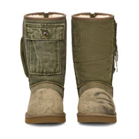 "Why reinvent the wheel when we can redefine it?" - Josue Thomas The UGG Gallery Dept. Canvas Boot is a one-of-a-kind made from recycled military canvas bags, inclusive of handles, pockets and clips. Inspired by Josue Thomas' passion for upcycling. If between sizes, recommended to size up. Artistic Details - One-of-a-kind canvas boot. - Upper is made from recycled military canvas bags. - Handles, pockets and clips from the same military canvas bags are featured on the boot. - Additional features include metal hardware, nylon straps, and a functional shaft pocket. - Back zipper closure. - Sugarcane EVA outsole and recycled polyester binding. - Minimal stretch material. - Appliqued with woven branded labels from both Gallery Dept. and UGG. If between sizes, recommended to size up. Material: 60% Upcycled Wool / 40% Tencel Lyocell (inner) / 100% Recycled Polyester (lining) / 100% Cotton (outer) Product Measurements: - Shaft circumference: 16.5" - Shaft height: 10" - Heel height: 1.25"
