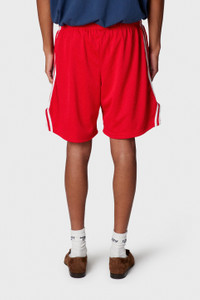 Introducing our latest iteration of the VENICE court shorts, featuring a refined silhouette that's slightly shorter than our last release, offering a fresh, modern fit without compromising on comfort and performance. Model: 6'2" wearing size L Artistic Details - Breathable mesh jersey gym shorts. - 8.25" inseam. - GD ENGLISH logotype at front. - Baggy fit with an elasticized waistband and inner drawstring. - Front slip pockets. - White striped piping over seams. - Double lined. Made in USA Material: 100% Polyester