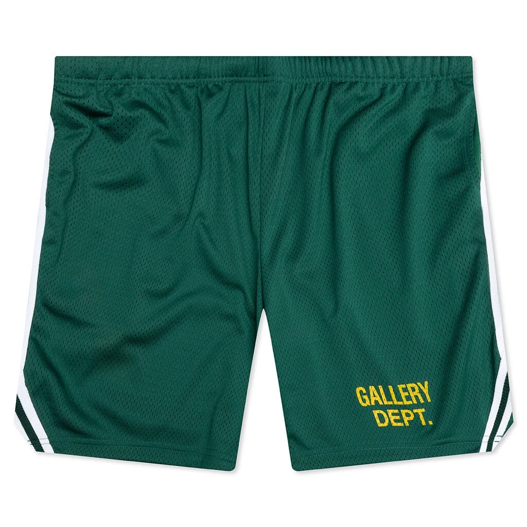 The Gallery Dept. Venice Court Shorts deliver a modern update to a classic athletic silhouette. Made from breathable mesh jersey, they feature a slightly shorter 8.25" inseam for a contemporary fit. The balloon shape offers relaxed comfort, while the elastic waistband with inner drawstring ensures a secure feel. The shorts are finished with front slip pockets, white striped piping, and the GD ENGLISH logotype at the front. They are double-lined for added structure and durability. Made in the USA. VCS 5245 GREE - 100% Polyester - Breathable mesh - 8.25" inseam - GD ENGLISH Logotype - Balloon fit - Elastic waistband - Interior drawstring - Side seam pockets - Striped piping - Double-lined - Style No: VCS-5245-GREE