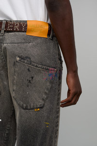 Loose, baggy denim featuring twisted seams, GD custom hardware, and embroidered detailing. Hand-painted by artisans at our Los Angeles maison. Model: 6" wearing size 32 Artistic Details - Loose, baggy fit. - Intentionally twisted seams on leg panels. - GD custom hardware. - Embroidered GD pin detailing on the coin pocket. - Hand-painted by artisans at our Los Angeles maison. - Debossed tan leather GALLERY DEPT. jacron on the back waistband. Made in USA Material: 100% Cotton