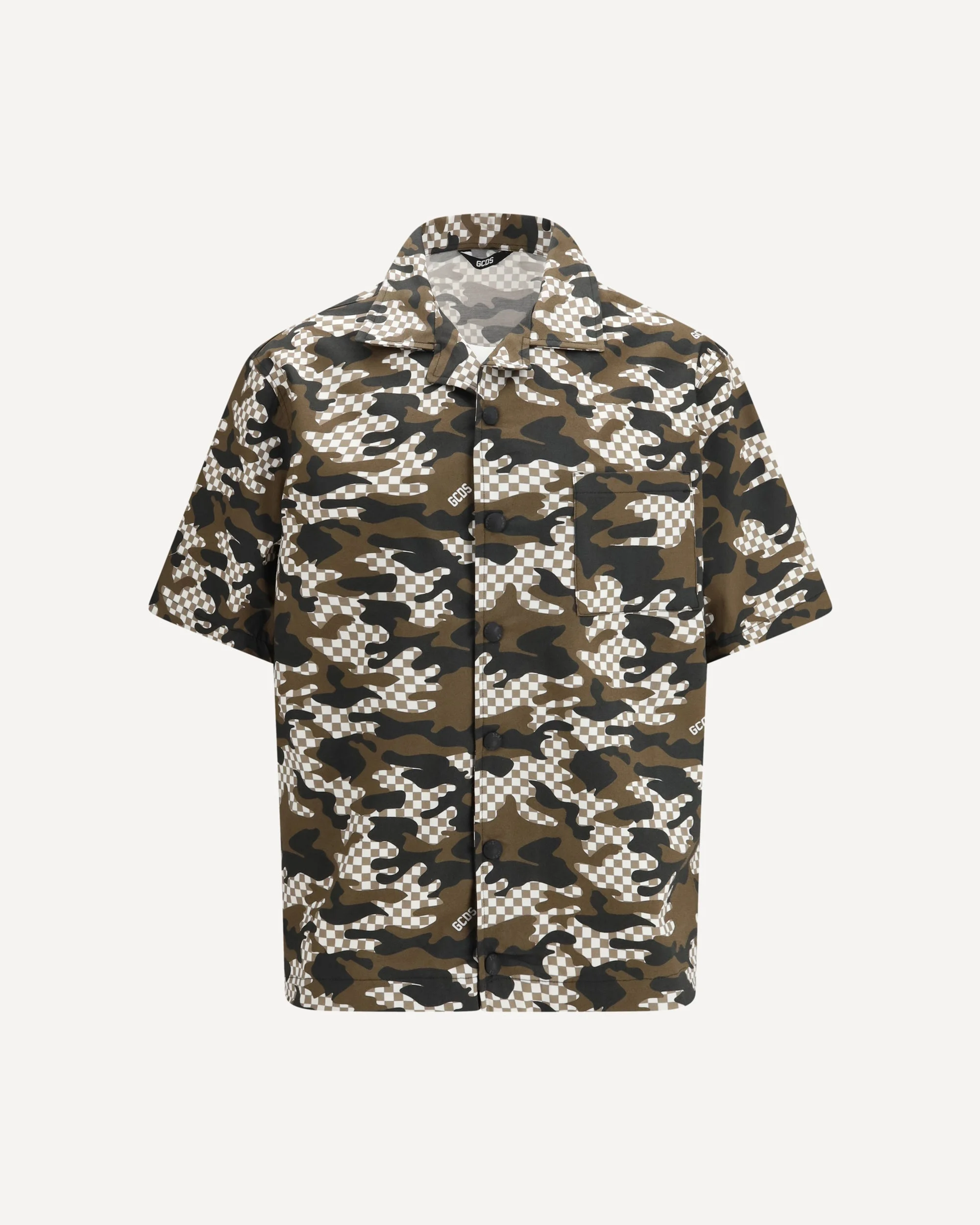 The Checked Camo Shirt by GCDS stands out for its all-over logo camouflage print, blending checked and camo patterns into a bold contemporary aesthetic. Designed with a point collar, front button closure and short sleeves, it features a chest pocket and a relaxed fit that enhances comfort and streetwear attitude. This GCDS shirt combines urban spirit with strong graphic identity in a distinctive piece. DETAILS - Sku: C1MWQH168T062_388B - Season: SS26 - Fit: Oversize - Composition: GENERAL 100% Cotton - MADE IN ITALY