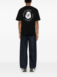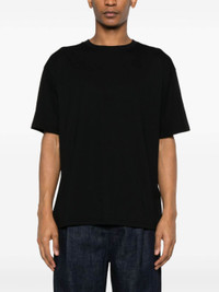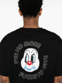 black cotton lightweight jersey crew neck short sleeves Clown print to the rear slogan print to the rear straight hem Size & Fit Model Measurements: Height: 1.87 m Bust/Chest: 92.0 cm Hips: 94.0 cm Waist: 71.0 cm Model wears size L Fabric and Care Designer Style ID: A2CM2305JE7 Designer Colour: 99 BLACK Composition: Cotton 100% Washing instructions: Machine Wash Made in Italy
