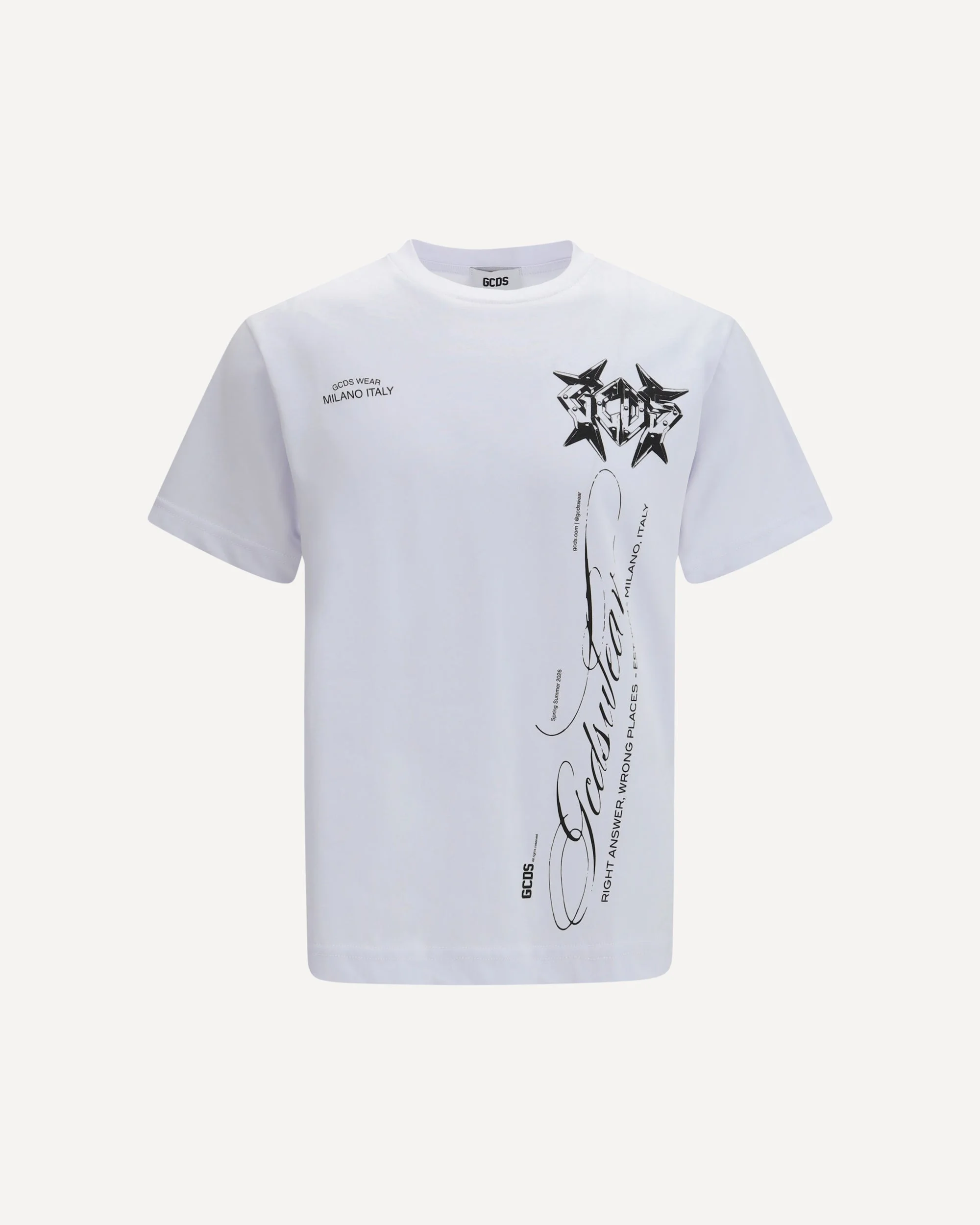 The History cotton T-shirt by GCDS traces the brand’s visual evolution through a vertical chest graphic and a maxi back print featuring iconic logos, lettering and historic symbols. Designed with a ribbed crew neck and regular fit, it balances bold graphic identity with everyday comfort. This GCDS T-shirt merges urban attitude with archival inspiration in a distinctive contemporary piece. DETAILS - Sku: C1MWQC070J079_100B - Season: SS26 - Fit: Regular - Composition: GENERAL 100% Cotton - MADE IN ITALY