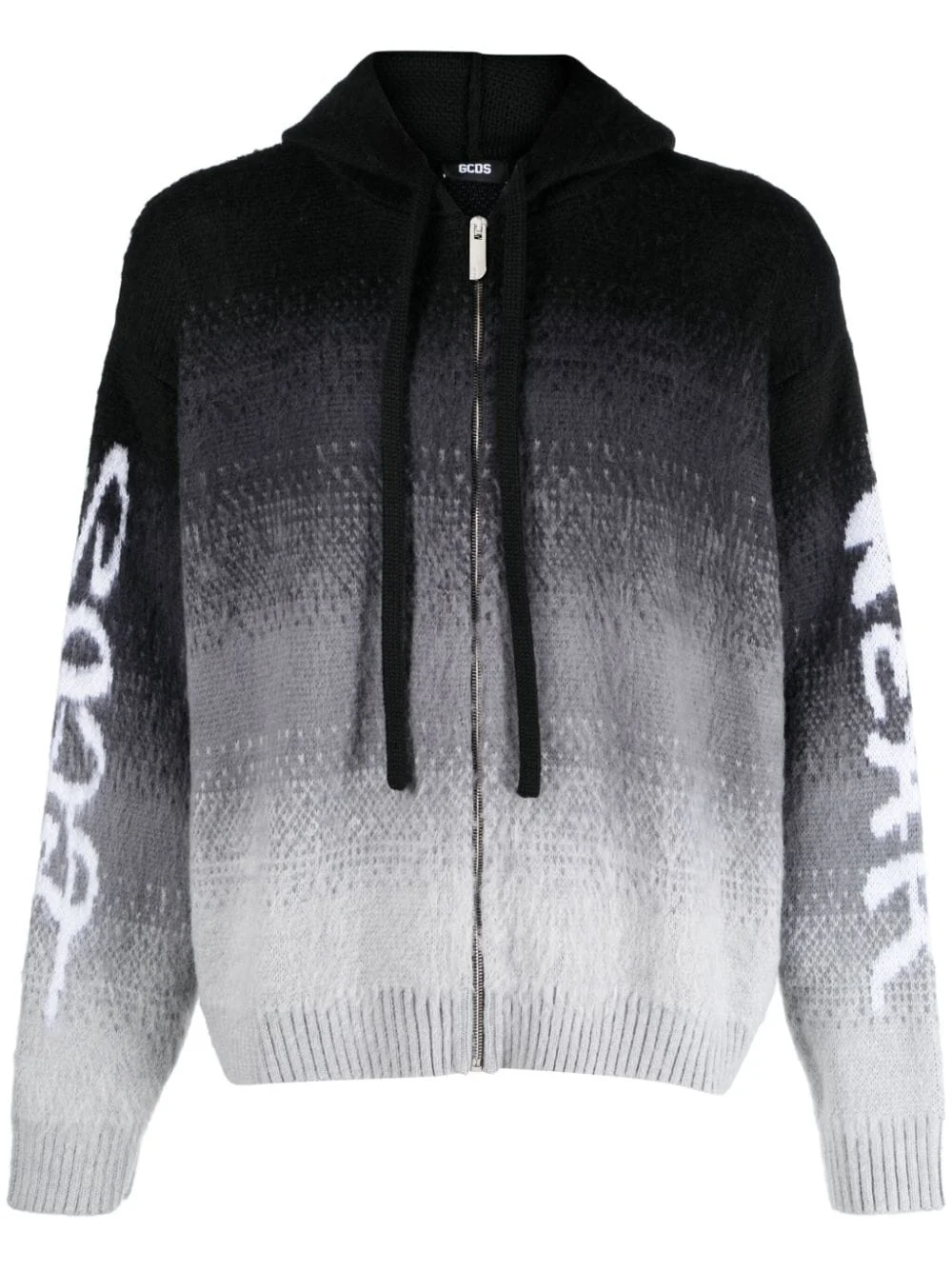 intarsia-knit hooded jacket Highlights - Black/grey - Virgin wool blend - Intarsia-knit logo - Brushed finish - Ombre effect - Slouchy drawstring hood - Front zip fastening - Drop shoulder - Long sleeves - Ribbed cuffs and hem - Straight hem Imported Composition Virgin Wool 50%, Acrylic 50% SIZE & FIT Model measurements Height 6 ft 2 in(1.88 m) Bust/Chest 37.79 in(96 cm) Hips 35.82 in(91 cm) Waist 29.92 in(76 cm) FittingInformation Designed to be unstructured, offering a loose fit throughout Made with a midweight knit, this piece offers some stretch This piece fits true to size – take your usual size Washing instructions Hand Wash