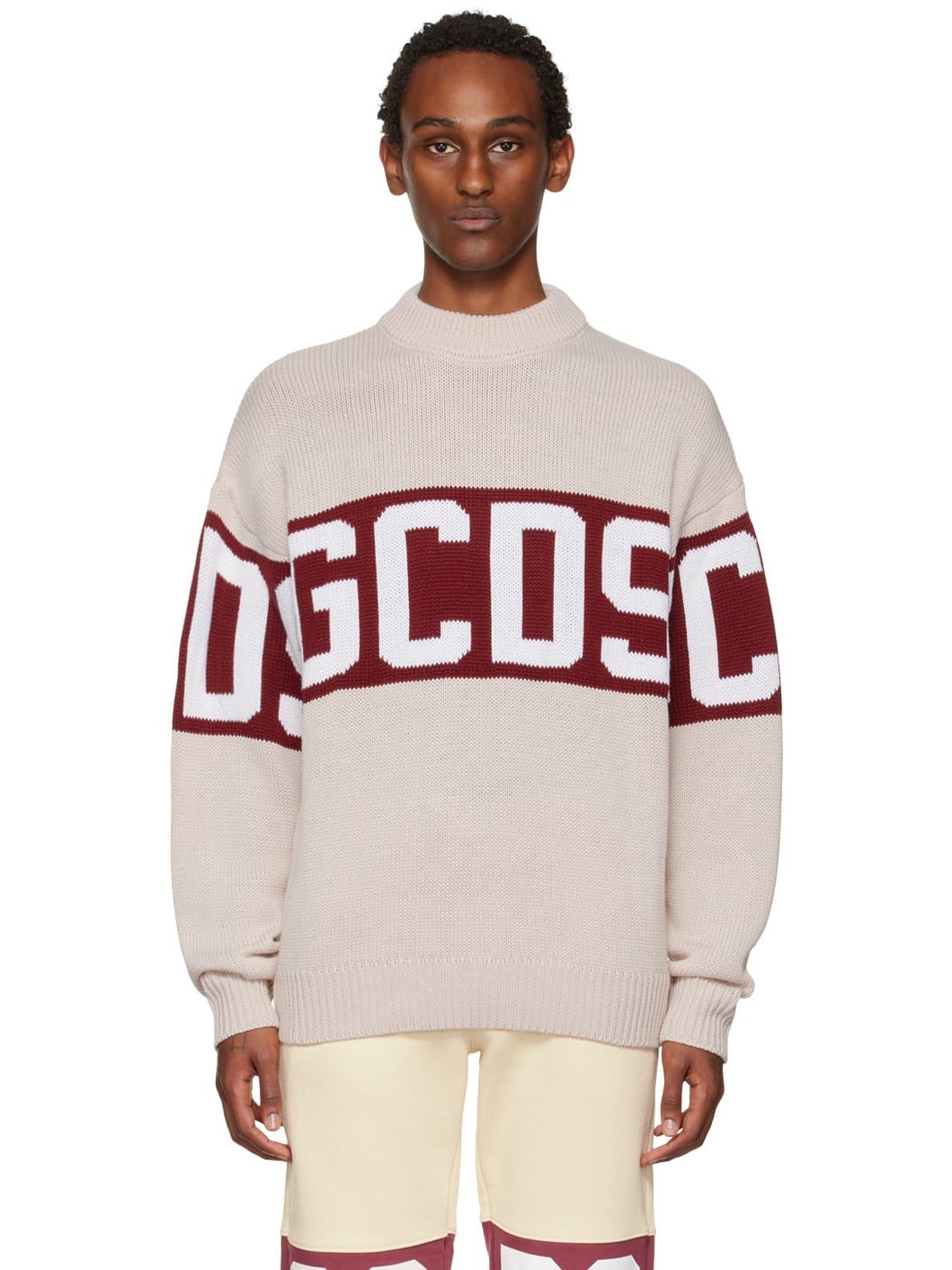 Knit wool and acrylic-blend sweater. Jacquard logo pattern throughout. · Rib knit crewneck, cuffs, and hem · Logo flag at side seam Supplier color: Off-white 50% wool, 50% acrylic.