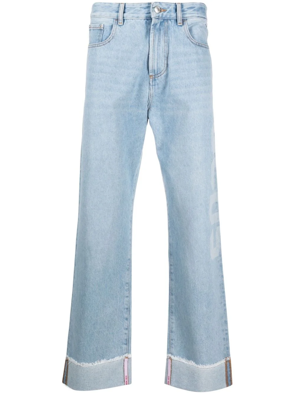 logo-patch straight-leg jeans Highlights - Light blue - Cotton - Denim - Logo patch to the rear - Logo print at the leg - Belt loops - Front button fastening - Mid-rise - Straight leg - Turn-up hem - Classic five pockets Made in Italy Composition glass 100%, Cotton 100% Washing instructions Machine Wash