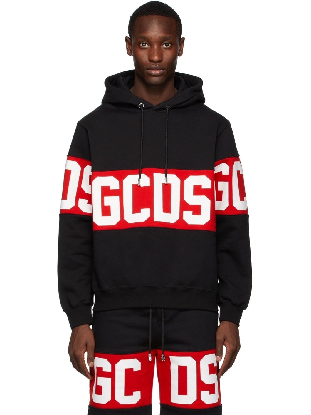 Long sleeve French terry hoodie in black and red featuring logo printed in white at front and back. · Drawstring at hood · Rib knit cuffs and hem · Webbing logo flag with silver-tone hardware at side-seam Supplier color: Black 100% cotton.