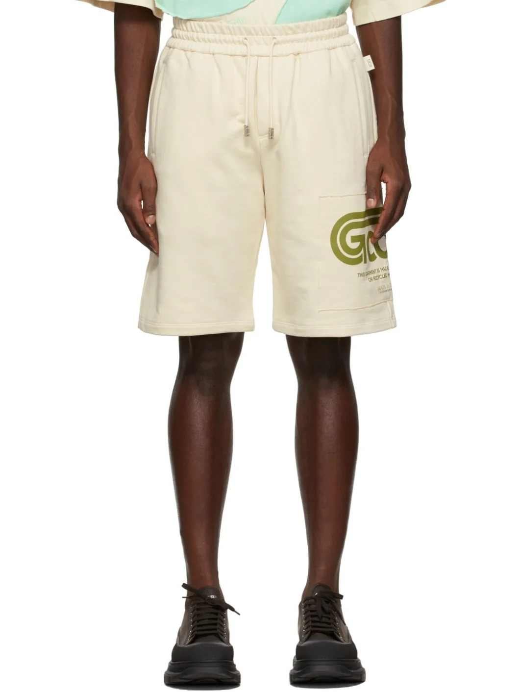 French terry shorts in off-white. Logo graphic printed in green at front and back. · Mid-rise · Three-pocket styling · Drawstring at elasticized waistband Supplier color: White cup 100% cotton.