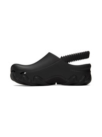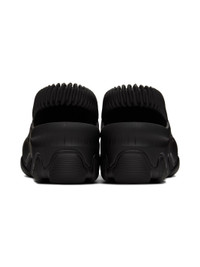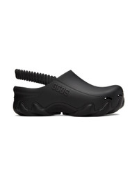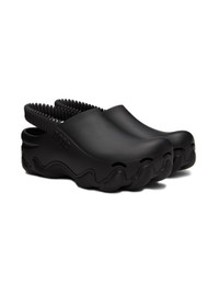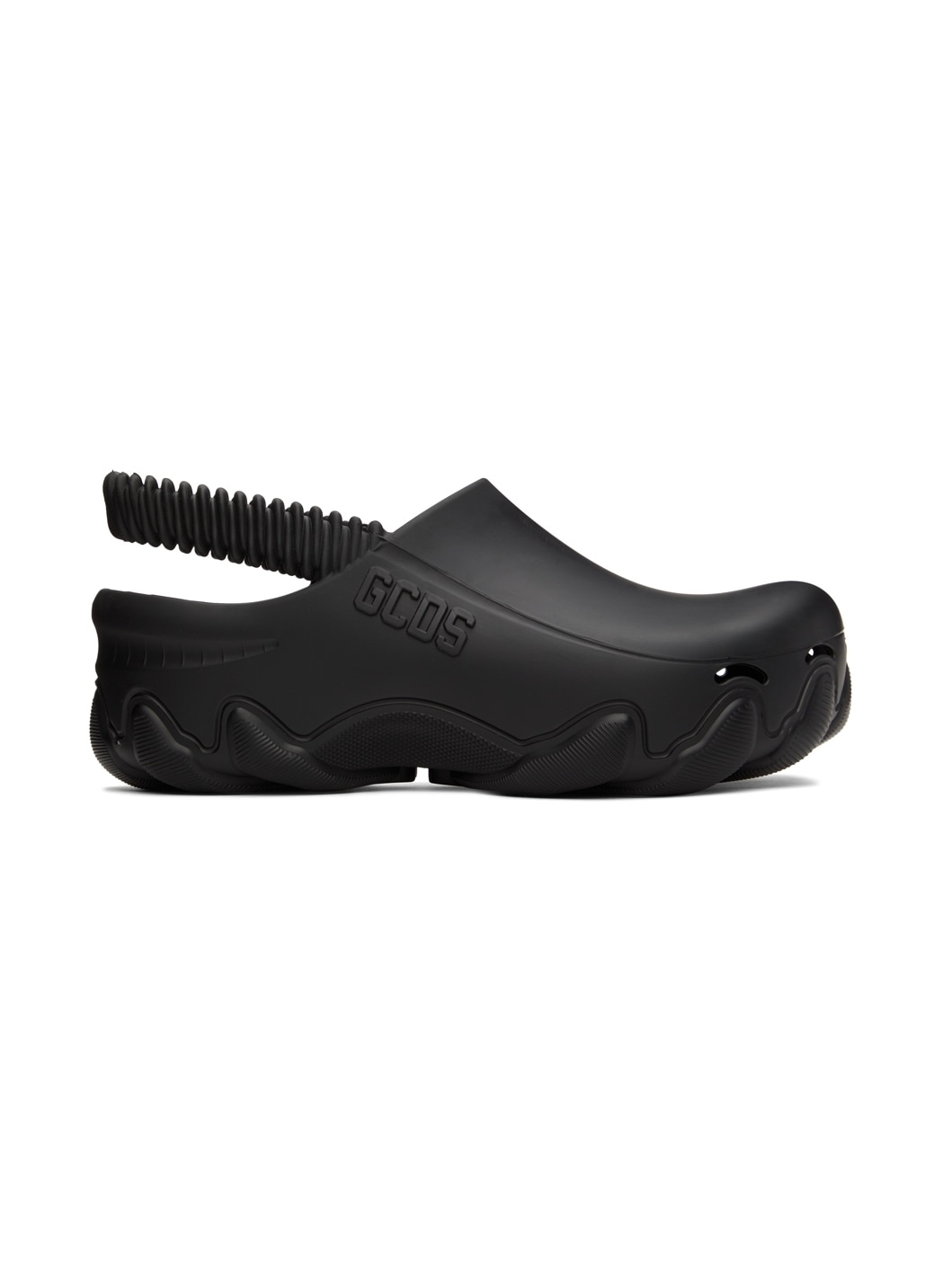 Rubber slippers in black. · Cut-outs at round toe · Textured detailing at fixed ankle strap · Logo embossed at outer side · Molded footbed · Detachable padded foam insole · Treaded rubber platform sole · Platform: H2 in Supplier color: Black Rubber.