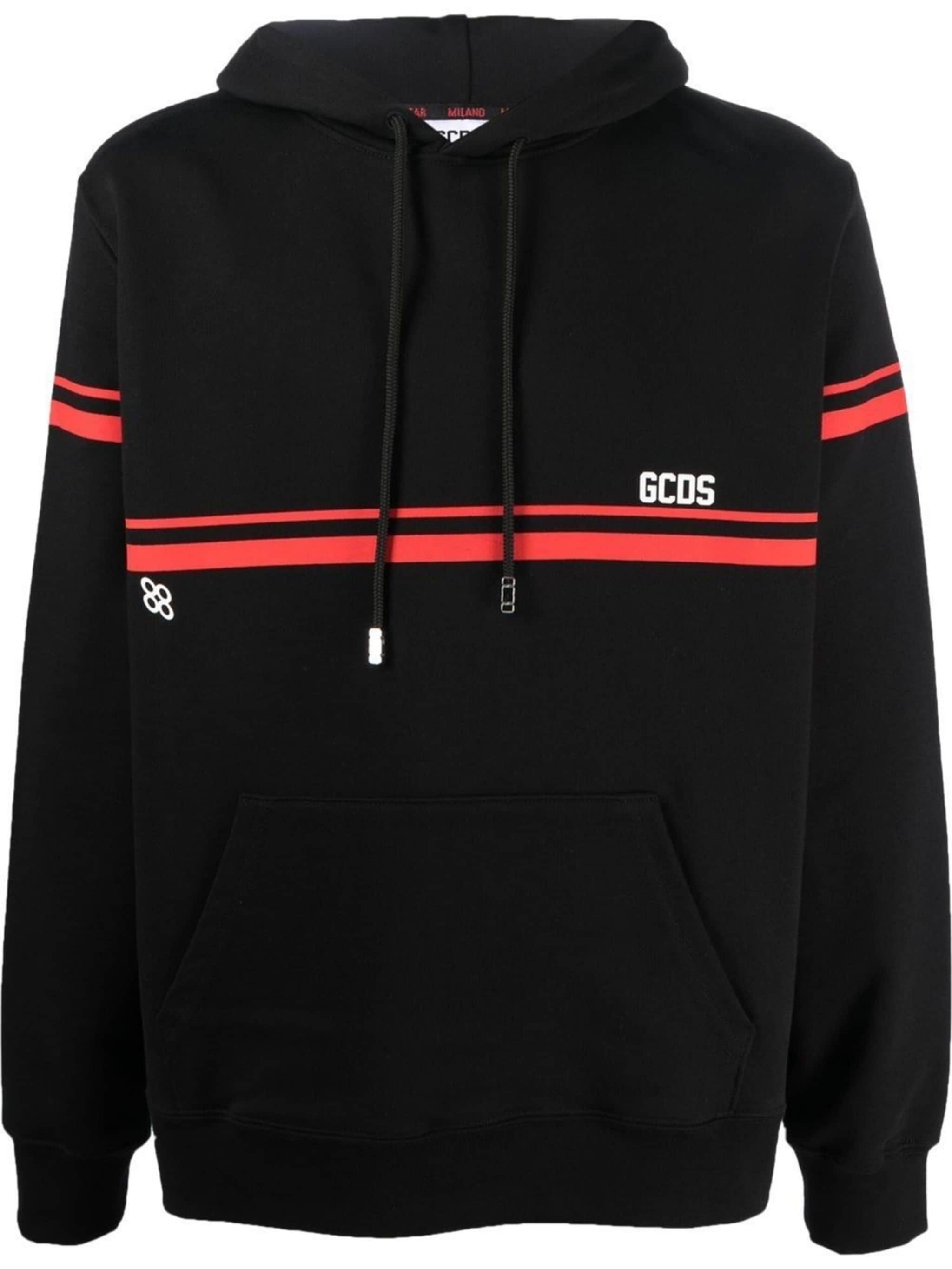 stripe-detail cotton hoodie from GCDS featuring black, red, cotton, stripe detailing, logo print at the chest, drawstring hood, front pouch pocket, long sleeves, ribbed cuffs and ribbed hem. Size & Fit Model Measurements: Height: 1.87 m Bust/Chest: 91.0 cm Hips: 90.0 cm Waist: 69.0 cm Model wears size L Fabric and Care Designer Style ID: SS23M100158 Designer Colour: 02 BLACK Composition: Cotton 100%Made in Italy