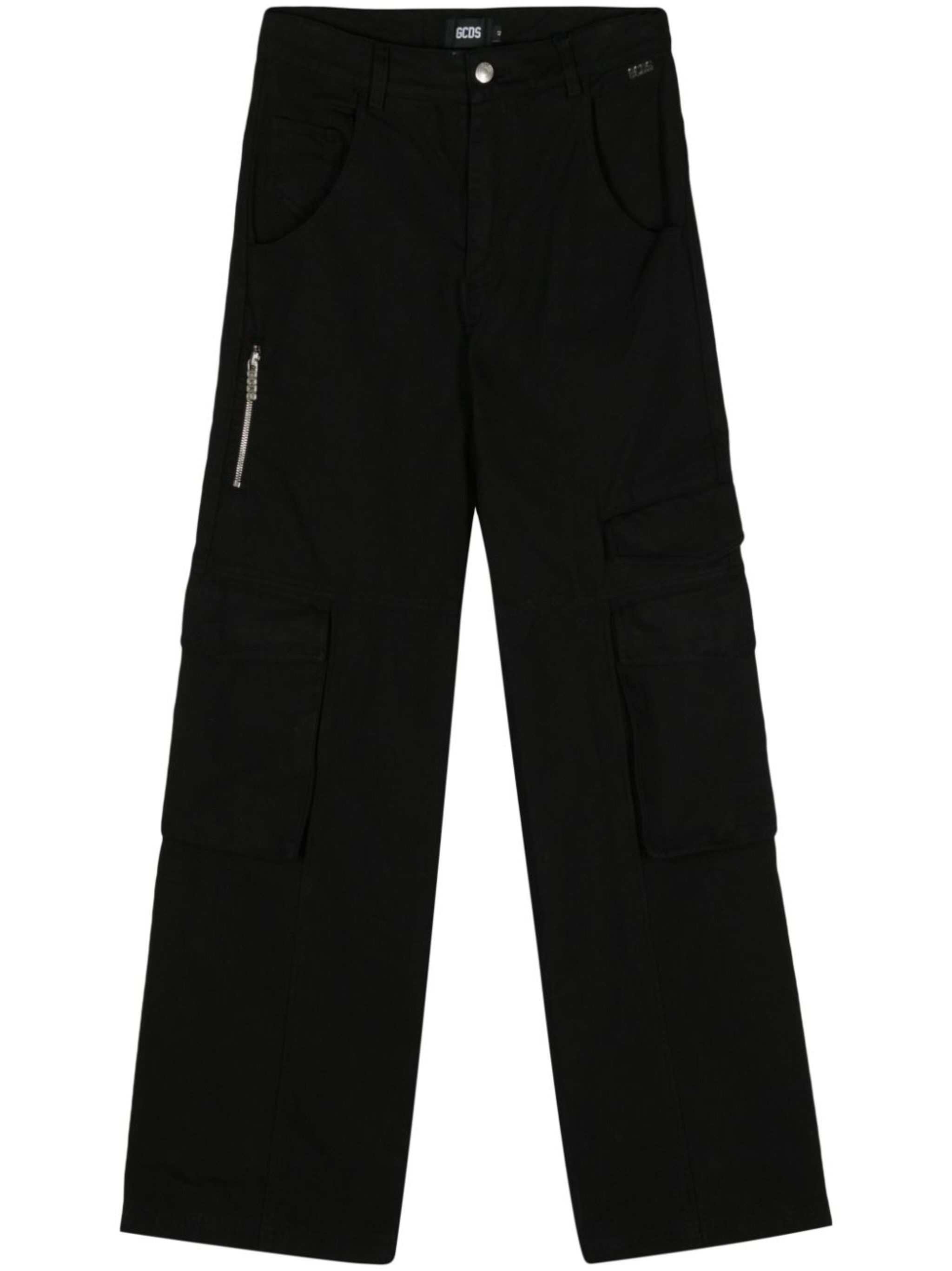 black cotton gabardine weave silver-tone logo plaque to the front logo patch to the rear branded zip puller high waist belt loops concealed fly and button fastening classic five pockets side zip-fastening pocket multiple cargo pockets wide leg Size & Fit Model Measurements: Height: 1.87 m Bust/Chest: 91.0 cm Hips: 94.0 cm Waist: 71.0 cm Model wears size 42 Fabric and Care Designer Style ID: A1OM2911TD3 Designer Colour: 99 NERO Composition: Cotton 100% Washing instructions: Machine Wash Made in Portugal