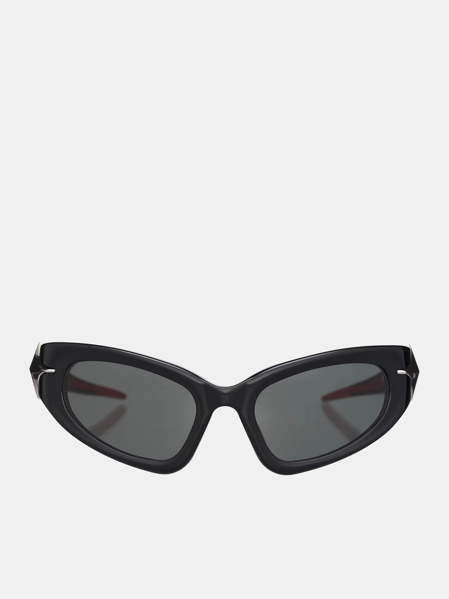 GENTLE MONSTER sunglasses in black, acetate construction, goggle shape, grey-tinted lenses, goggle shape, softly curved temples, flat tips, "BOLD" collection signature symbol, case included. Made in China Acetate One Size