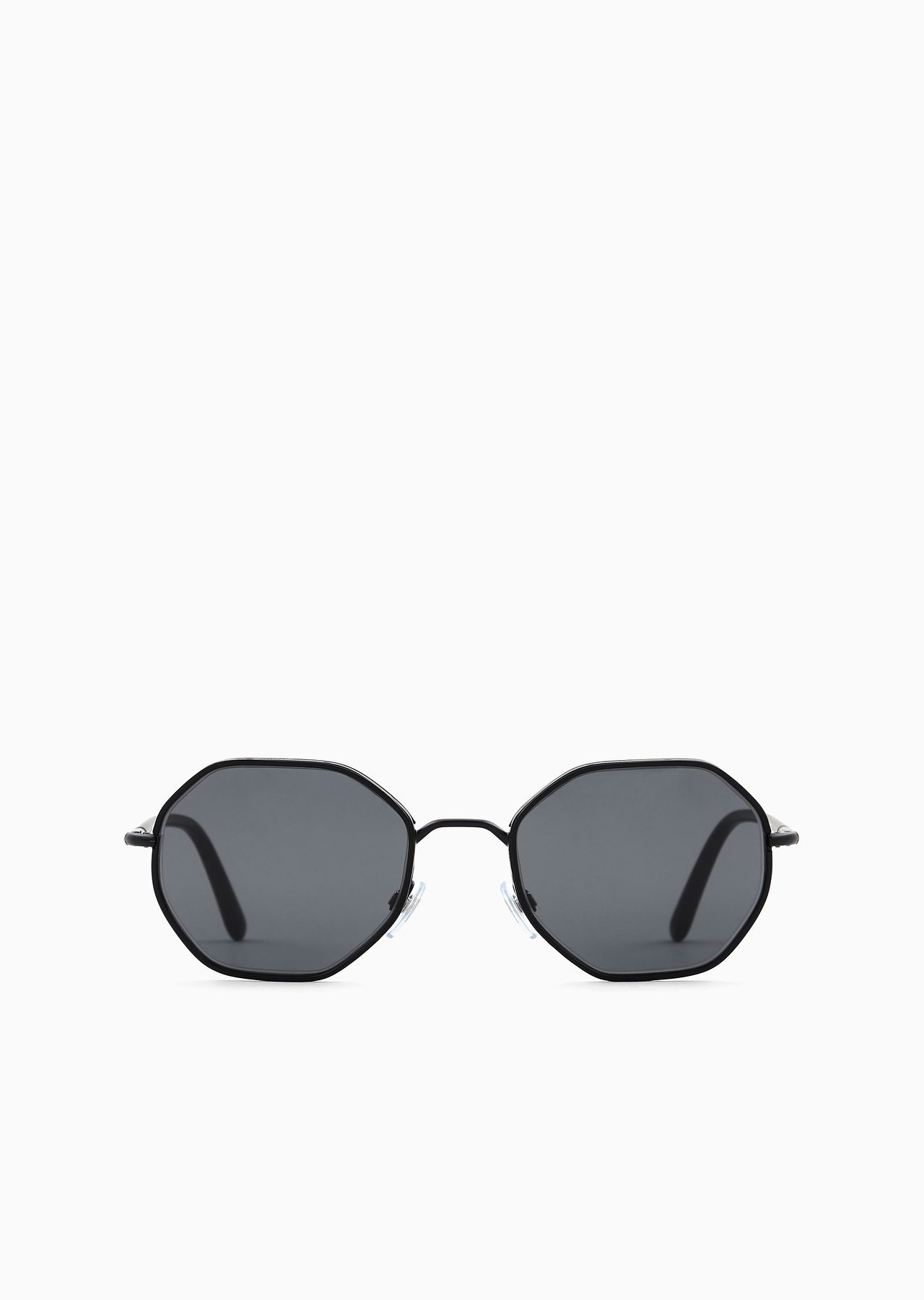 Distinctive hexagonal shape with fine acetate rim cover and metal flex hinge temples, embellished with laser logo and iconic rombo stud on the acetate temple tips. Product Code: AR6112J.L300187.L152.L Details Composition 100% Metal Frame material: metal Shape: hexagonal Lens diameter/bridge width/temple length: 52/21/145 mm Lens material: crystal Rx-able: yes, standard Frame color: total matte black Lens color: smoke