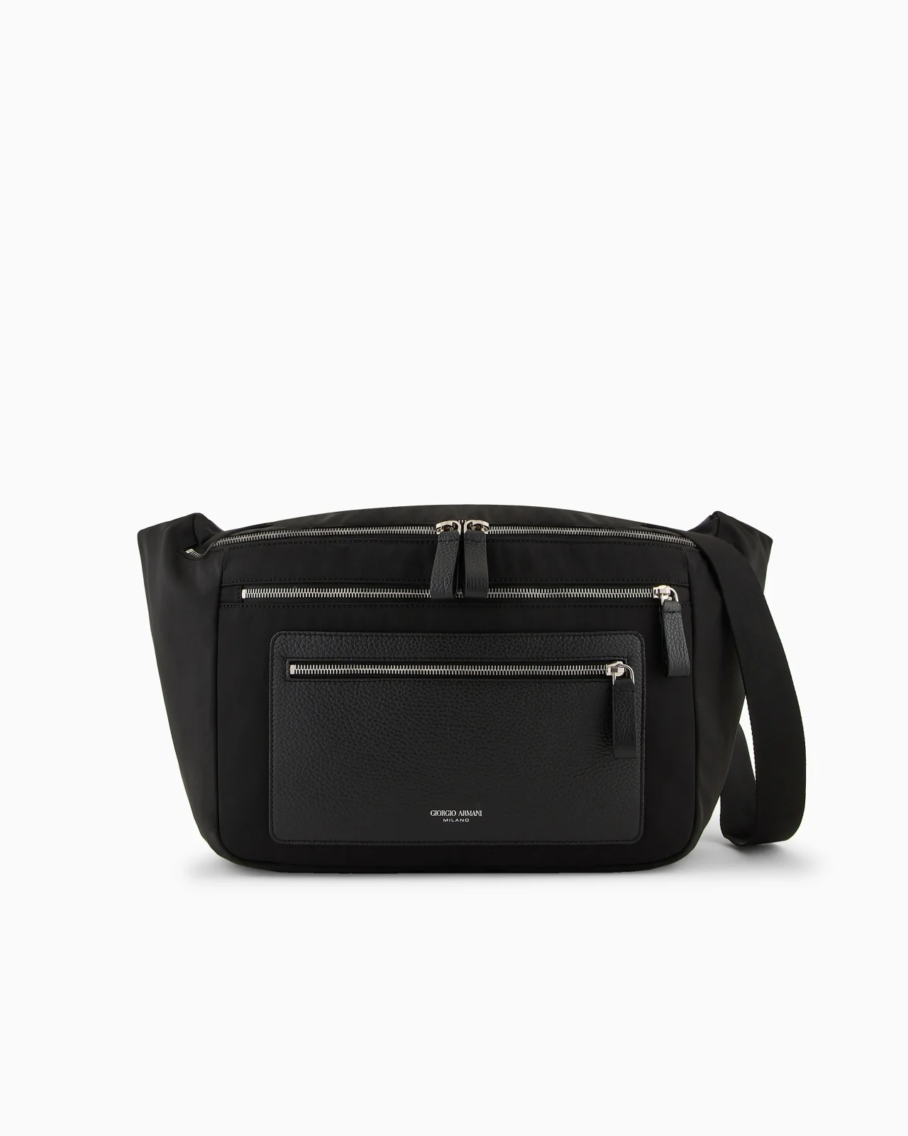New crossbody bag made of recycled nylon and pebbled leather, with generous volumes, designed to take with you any time of the day. Featuring two large zip pockets, it has an adjustable webbing shoulder strap and a pebbled leather outer pocket. A versatile, hard-wearing accessory with an urban attitude. Product Code: Y2O179Y752E180001 Details Composition 100% Polyester 0% Bovine leather Adjustable webbing shoulder strap Double front pocket with zip closure Zipped main compartment Front pocket in pebbled leather Heat-stamped Giorgio Armani logo Measurements: 50 x 24 x 13 cm Made in Italy