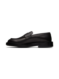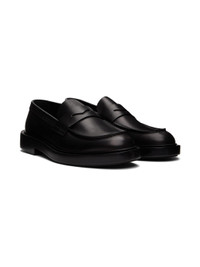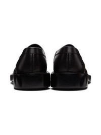 Buffed calfskin slip-on loafers in black. · Round moc toe · Strap with cutout at vamp · Logo embossed at padded leather footbed · Suede and buffed leather lining · Stacked leather midsole and block heel · Treaded rubber outsole · Heel: H1.25 in Supplier color: Black Upper: calfskin. Sole: rubber. Made in Italy 222262M231000