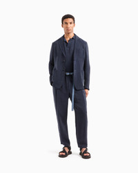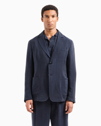 Single-breasted jacket made of cupro, a special natural-origin fibre that is subsequently enzyme-treated. It is selected for its distinctive fluid, almost liquid appearance, a prominent feature of the brand’s clothing. The style has notched lapels and patch pockets, and is distinguished by the chevron jacquard, which further accentuates its silky finish. A versatile offering designed for day-to-night use. <br>The piece is part of the Holiday selection that plays with a striking colour palette, incorporating black onyx, sky blue and ivory. Such shades are combined with luxurious fabrics like linen and silk, and iconic ones, like cupro and Lyocell, creating a unique experience in texture. Modern, relaxed shapes dress up different occasions with unmistakable Giorgio Armani style. Single-breasted jacket Notched lapels Two-buttoned, single-breasted closure Breast patch pocket Two front patch pockets Buttons at the sleeve hem Unlined Length: 73 cm Made in Italy Product Code: GM001935TE16001UB100