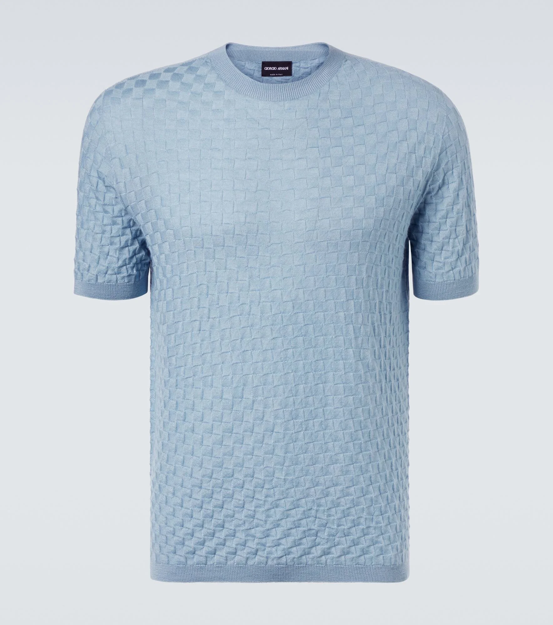 Known for its streamlined modernity, Giorgio Armani presents an elegant take on classic silhouettes. Crafted from ultra-soft cashmere and silk, this short sleeve sweater is knit with a plain and purl stitch finish for a charming three-dimensional effect. Product Details - Material: 70% cashmere, 30% silk - Care instructions: hand wash - Made in Italy - Designer color name: Arona - Item color: blue - Collar: crewneck - Item number: P01047851 Size & Fit - True to size - Designed for a loose fit - Stretchy fabric - Falls to the hip - Height of model is 188cm-74" and wears a size IT 50