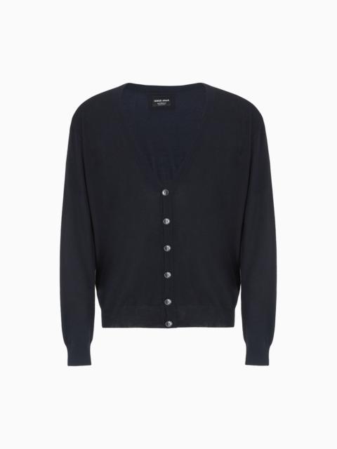 Cardigan with clean lines made from cosy cashmere yarn. The style has a V neck and button closure and thanks to its clean, streamlined design, it lends itself to numerous combinations. Fineness: 18 V neck Long sleeves Six-button fastening Ribbed cuffs and hem Made in Italy Product Code: 8NSE49SM98ZUBSG